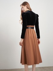 春秋の女性のベルベット長袖ベルベット パッチワーク パーティー ミディ ドレス ロング スプリング 春物 オータム 秋物 pri19428355707