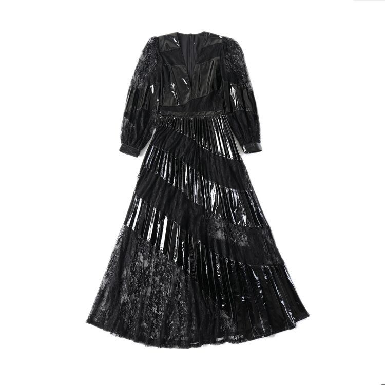 春秋の女性のシックな V ネックのセクシーなパーティー レース パッチワーク ブラック ロング ドレス スプリング 春物 オータム 秋物 Vネック pri21721091858