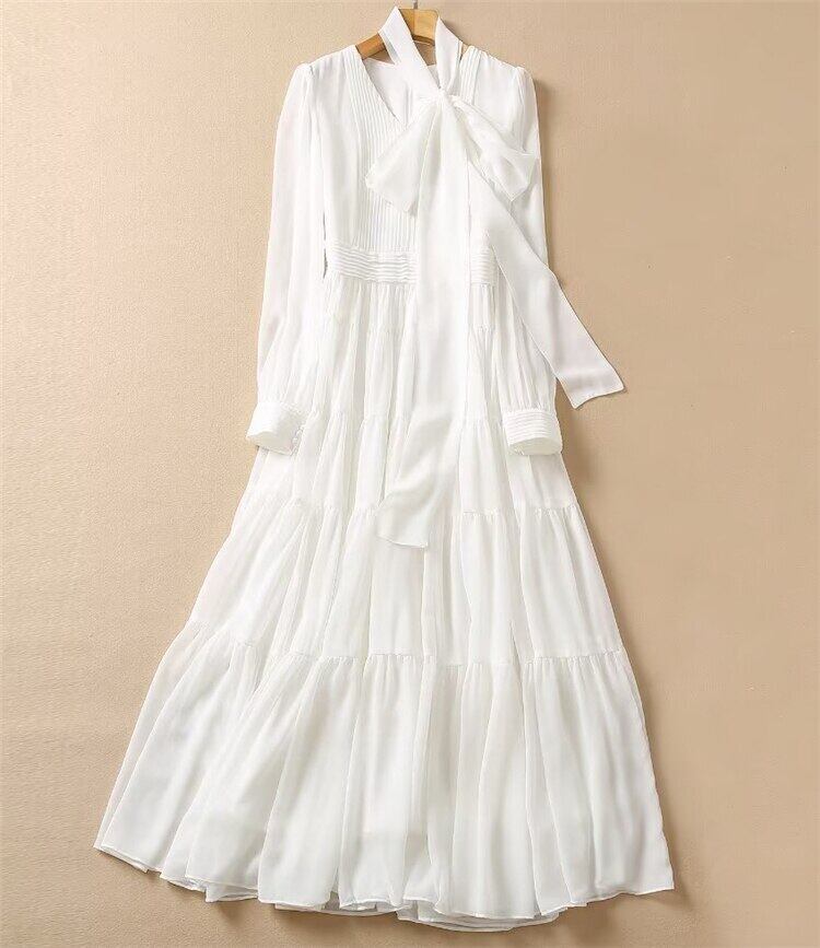 滑走路の女性春秋パーティー長袖プリーツ ホワイト ロング ドレス スプリング 春物 オータム 秋物 pri88268603644