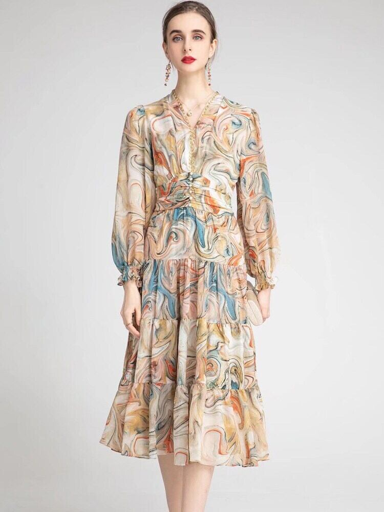 女性の 2022 春夏プリント ビーズ ミディ ドレス トレンディなオフィス パーティー ドレス スプリング 春物 サマー 夏物 会社 学校 通勤や通学にも pri37103443787