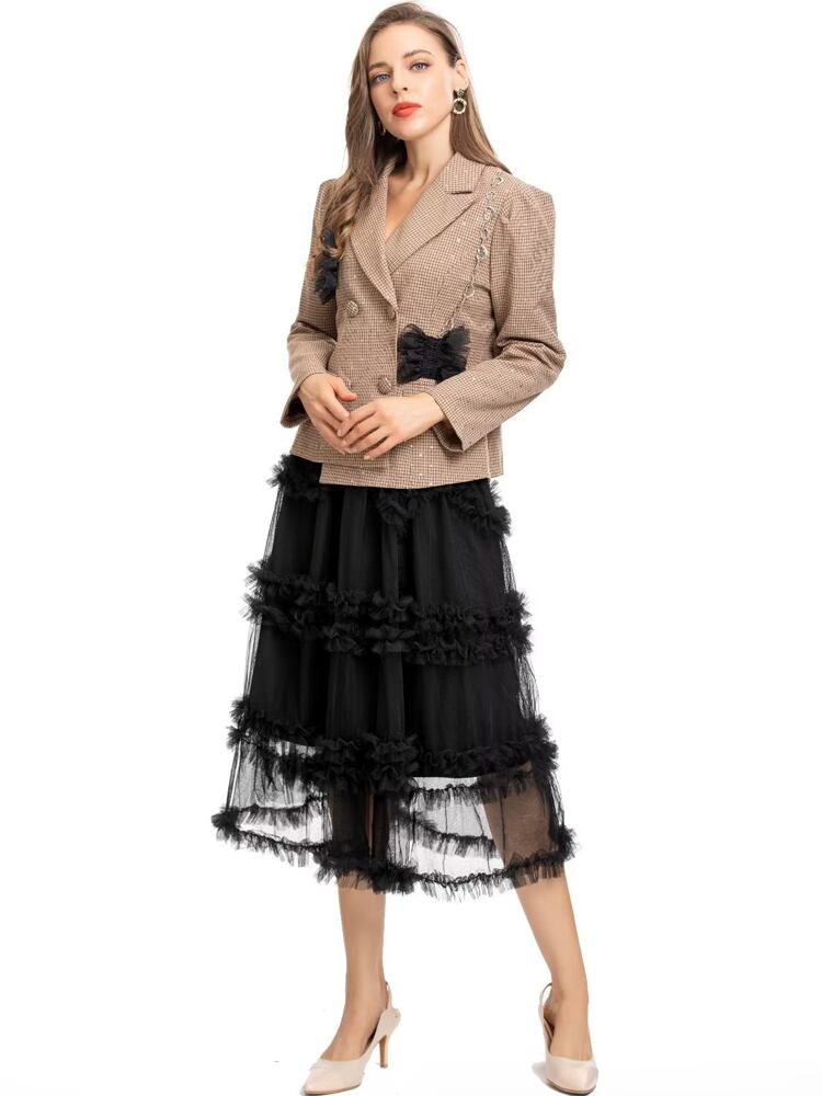 秋の女性のセット ジャケット トップス黒メッシュ スカート職場パーティー スーツ ブラック レース オータム 秋物 pri95354354665