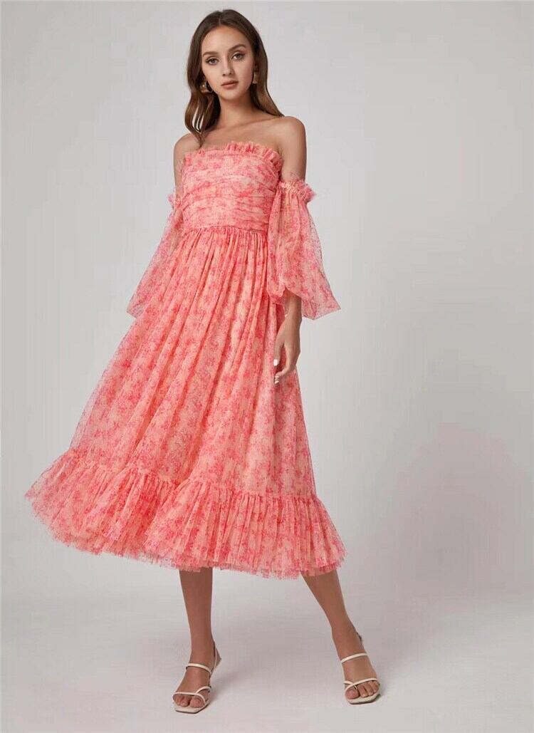 s レディース サマー バルーン スリーブ ゴージャス セクシー メッシュ イブニング パーティー ミディドレス 夏物 pri70021727163
