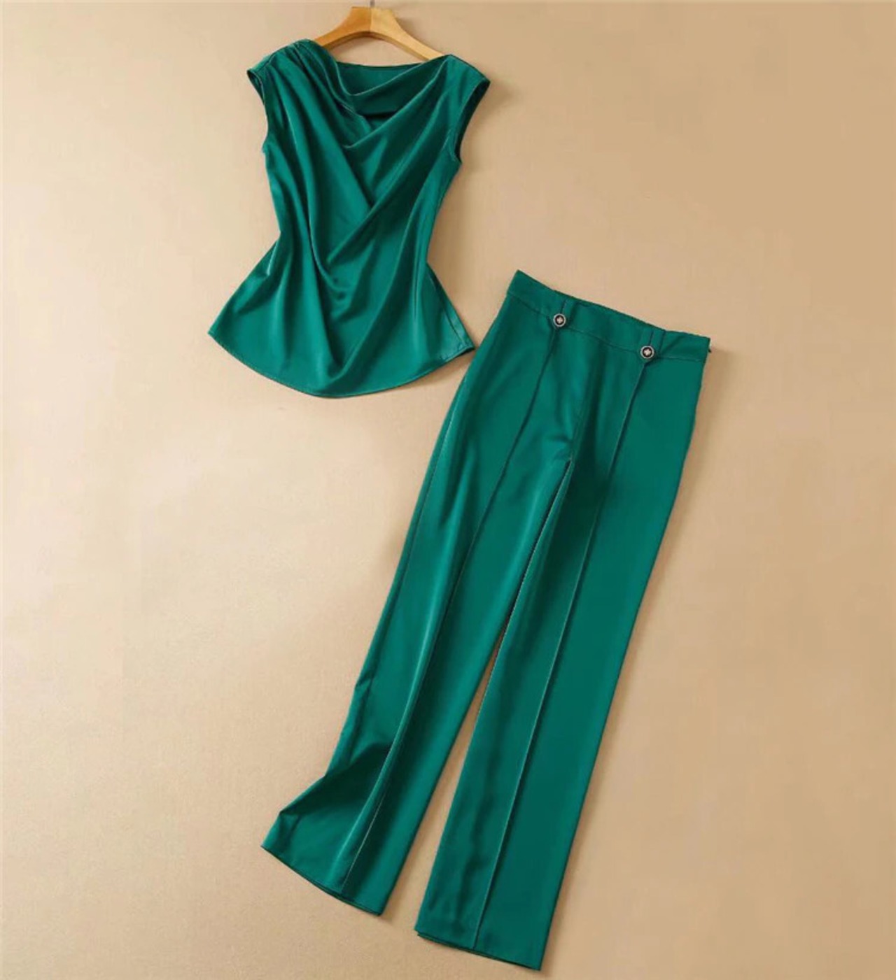 夏の女性のセット シャツ トップス スリム パンツ パーティー グリーン スーツ サマー 夏物 pri12002917107