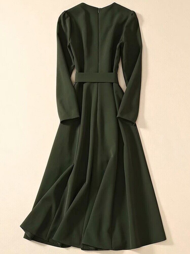 ケイト春秋の女性の職場パーティー ミディ グリーン長袖ドレス ロング レース スプリング 春物 オータム 秋物 pri6751778159