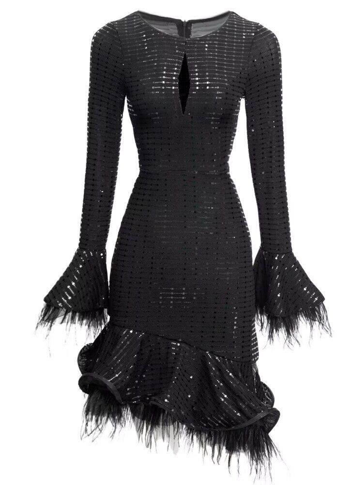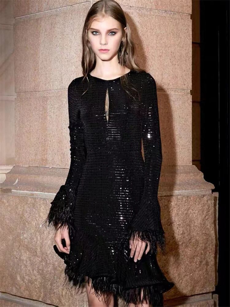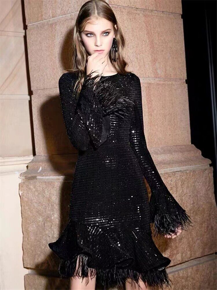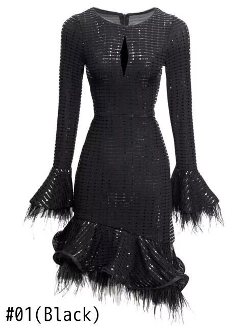 春秋の女性長袖セクシーなセレブパーティー羽黒スリムミニドレスシック ロング ブラック スプリング 春物 オータム 秋物 pri93913671004