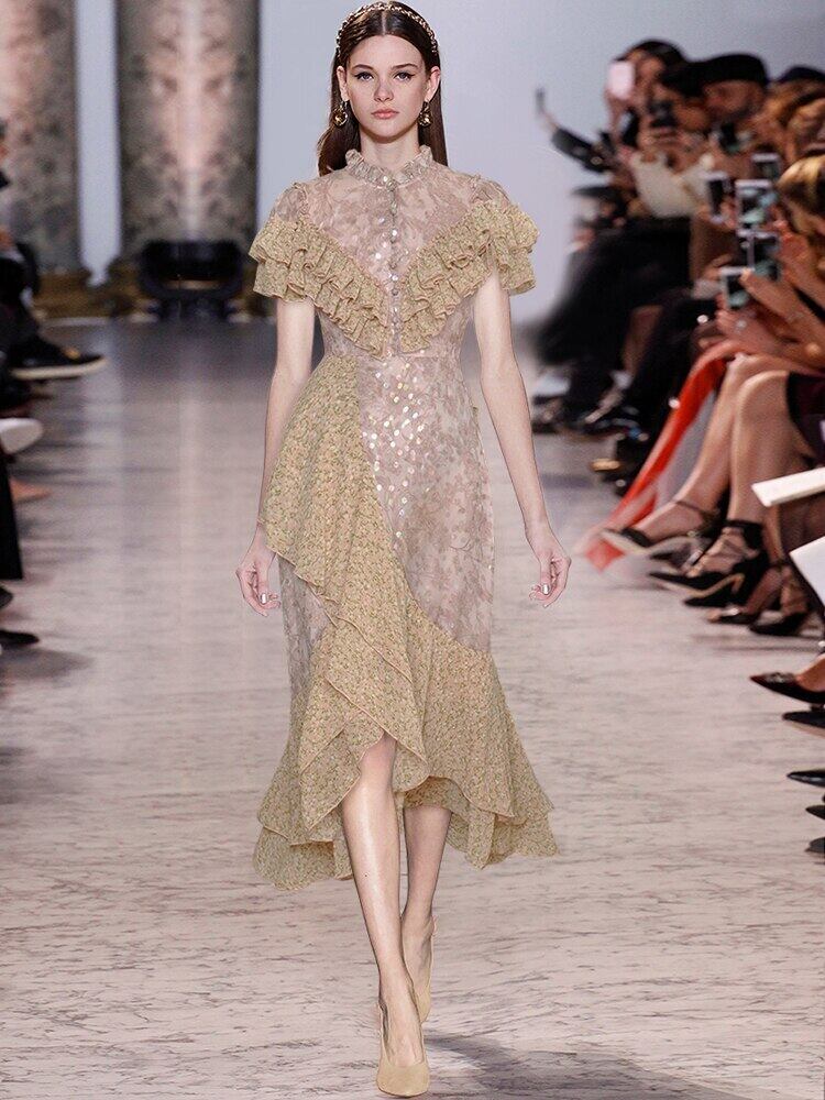 滑走路の女性の夏のセレブリティ パーティー ゴージャスなプリント フリル ミディ ドレス サマー 夏物 pri18179499535