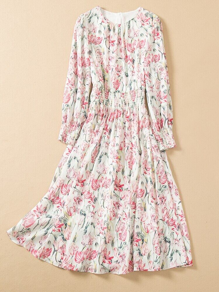 女性の春秋の弾性ウエスト ミディ シフォン プリント長袖パーティー ドレス ロング エラスティック 伸縮 スプリング 春物 オータム 秋物 pri75603979492