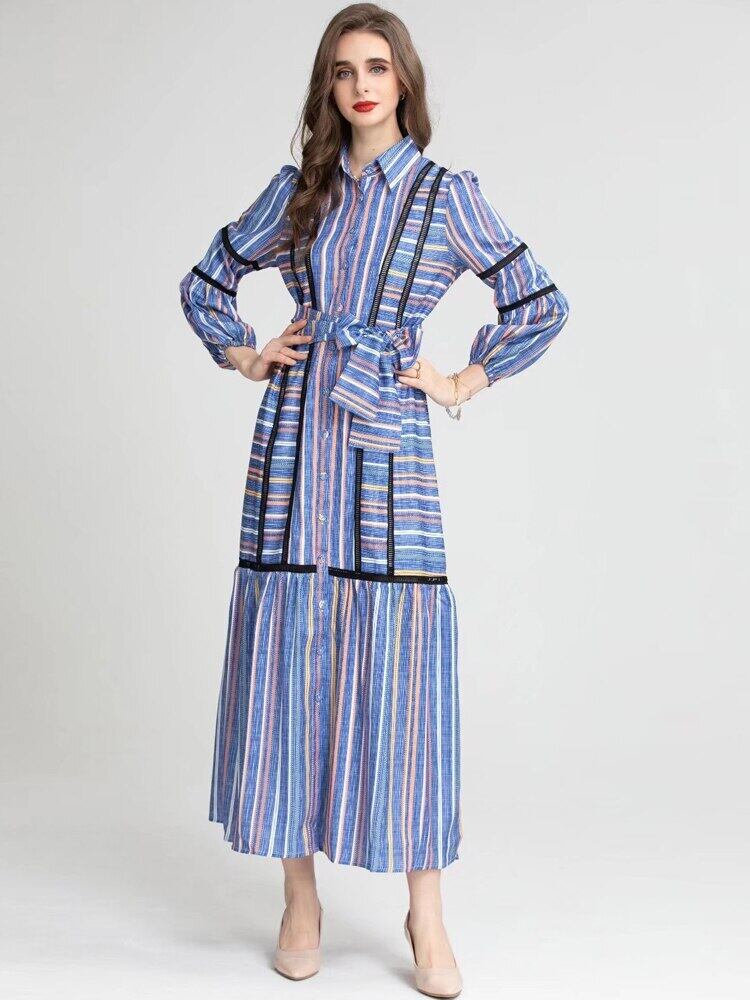 春秋の女性ストリート パーティー オフィス ストライプ長袖ロング ドレス スプリング 春物 オータム 秋物 会社 学校 通勤や通学にも pri18994042429