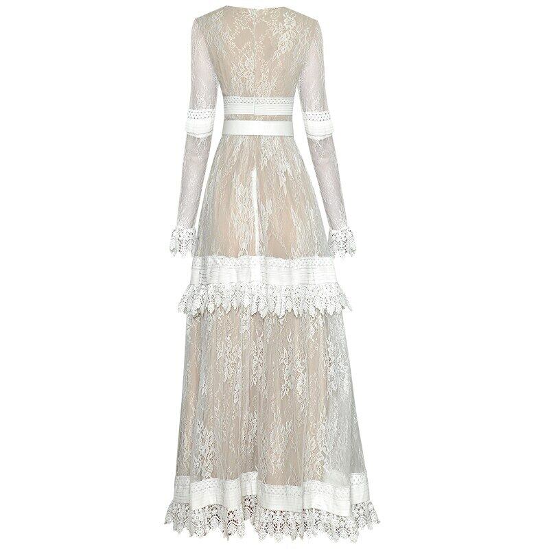 春の女性のボヘミア パーティー セクシーな長袖ホワイト レース ロング ドレス スプリング 春物 pri53865018004