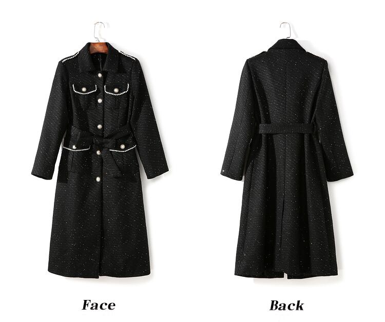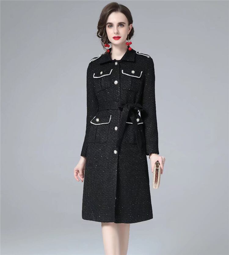 トレンチコート秋の女性ビーズボタンブラックツイードパーティーロングスリーブジャケット 長袖 オータム 秋物 pri20584678700
