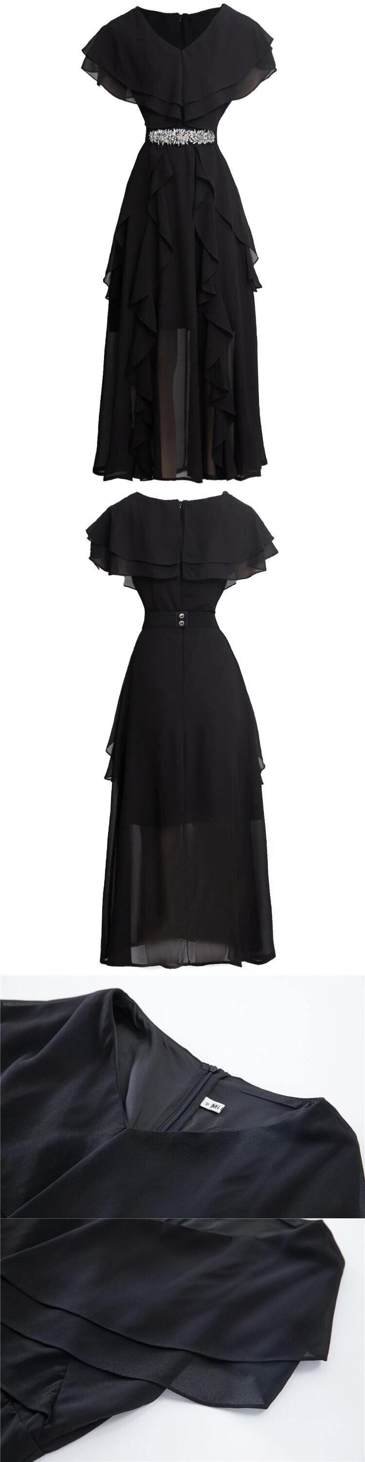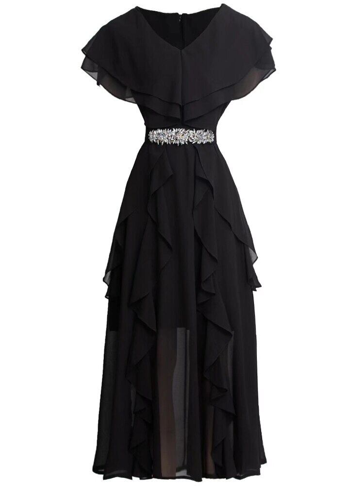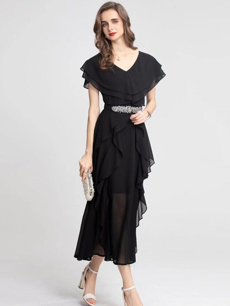 女性の夏のストリート パーティー ダイヤモンド ベルト スリム フリル シフォン ミディ ドレス サマー 夏物 ハーネス pri61795291275