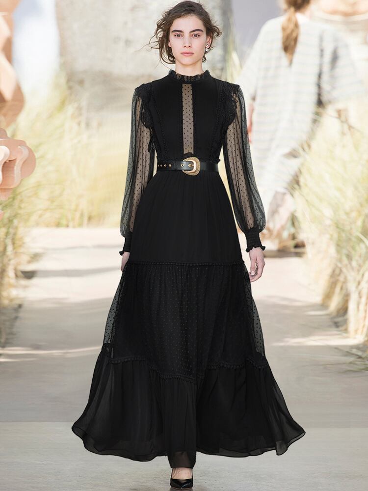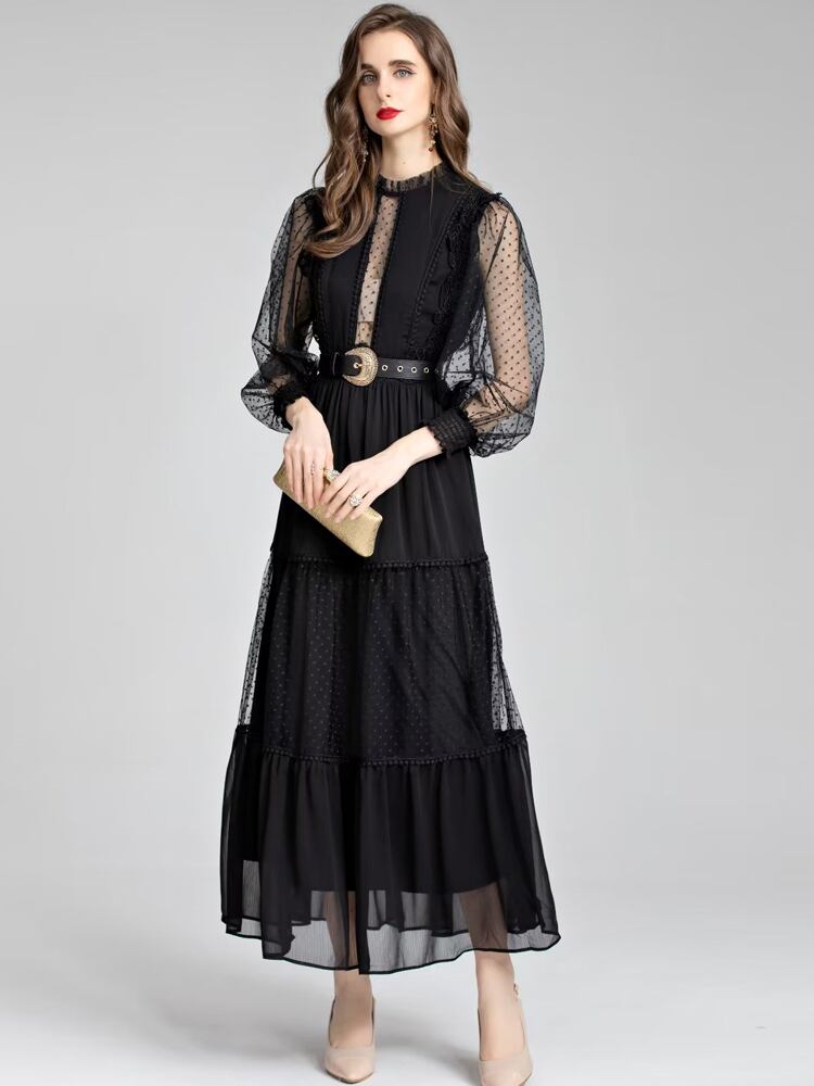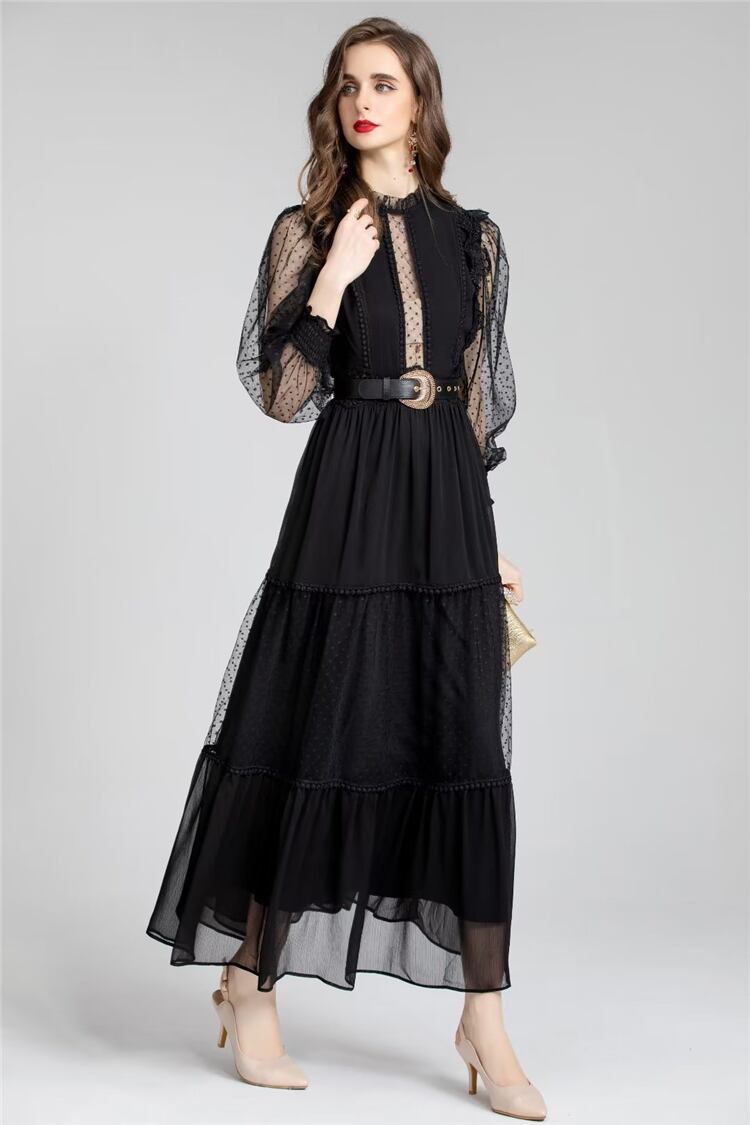 s 春秋の女性のストリート セレブリティ パーティー セクシーな刺繍黒のロング ドレス レッド ブラック スプリング 春物 オータム 秋物 pri13306006200