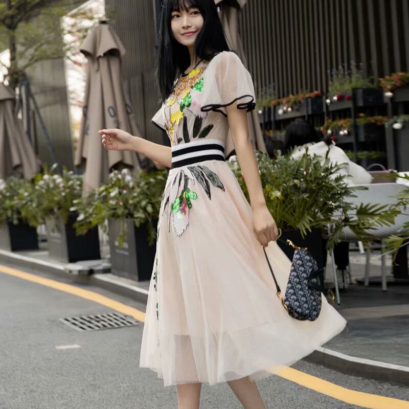 女性の夏のミディドレス紳士パーティーオフィススパンコール刺繍メッシュドレス サマー 夏物 会社 学校 通勤や通学にも pri36372456761