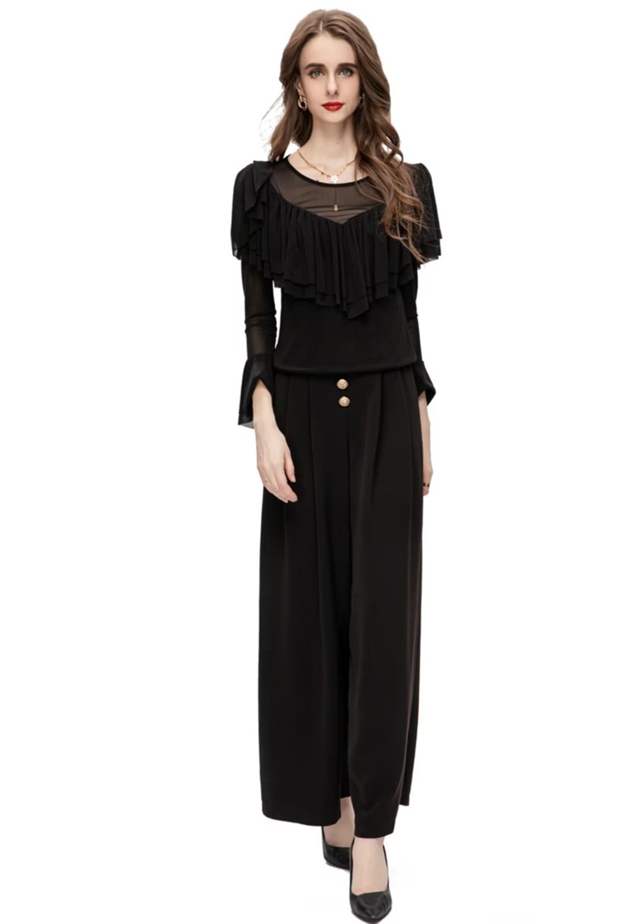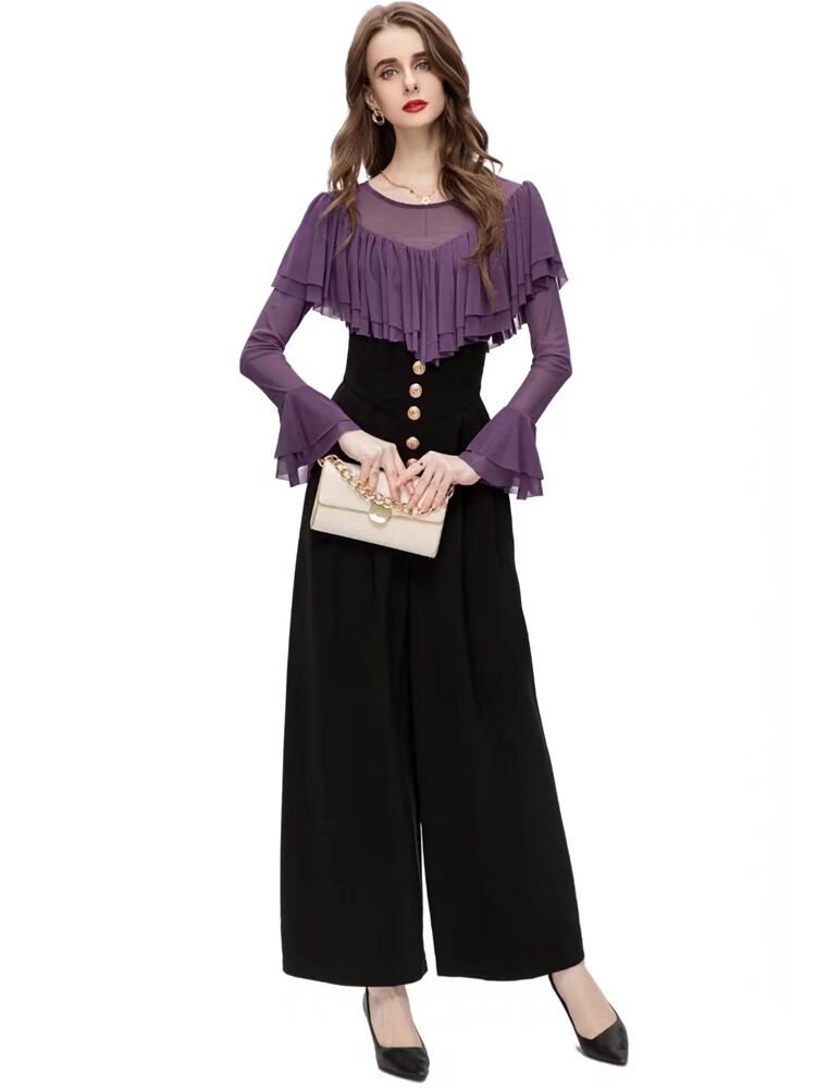 秋の女性セット フリル弾性トップス ズボン職場スーツ レース エラスティック 伸縮 オータム 秋物 pri57953799010