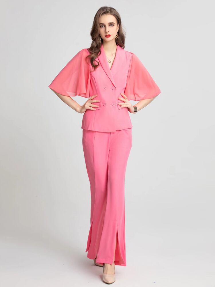 夏レディースセットスーツトップス黒パンツ職場ピンクスーツ ブラック レース サマー 夏物