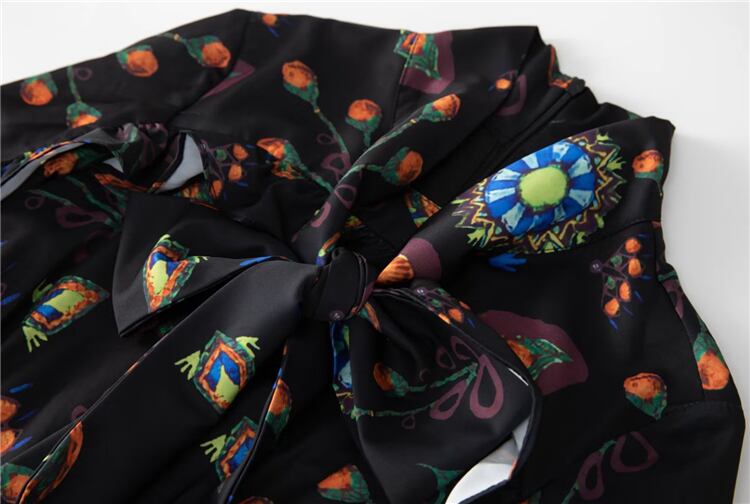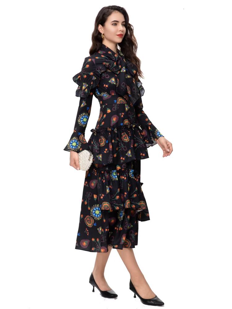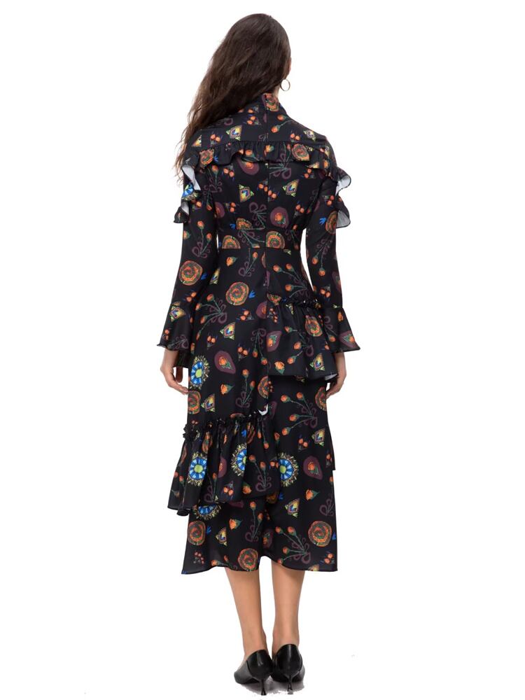 春秋のの有名人長袖プリント フリル ミディ ドレス パーティー シック ロング スプリング 春物 オータム 秋物