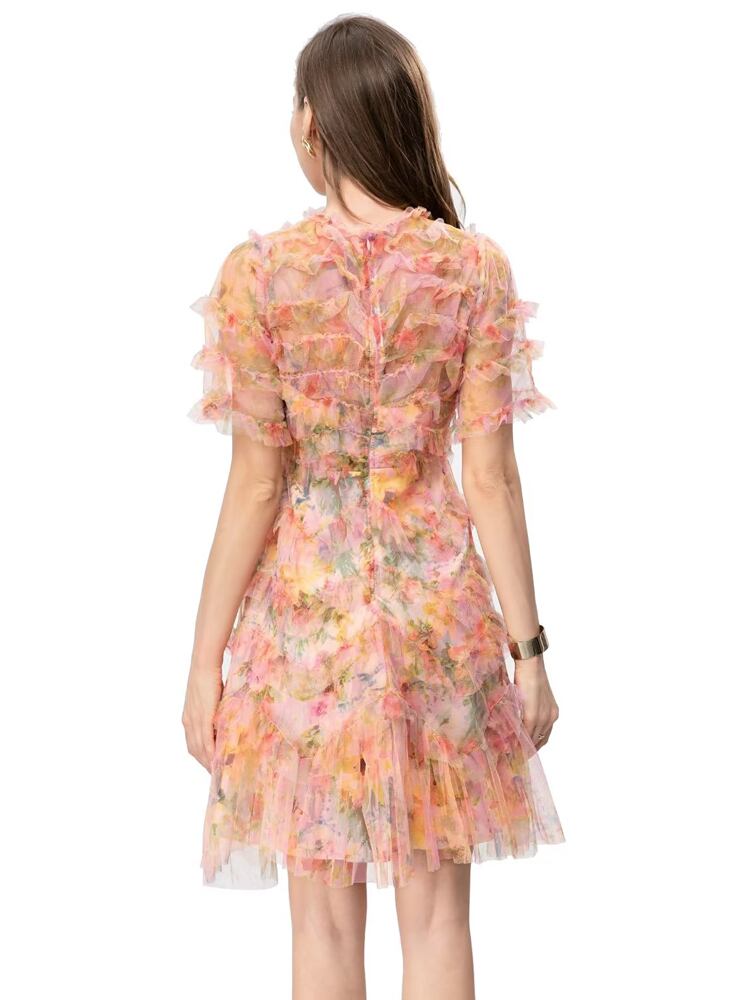 夏のの豪華な有名人フリル プリント メッシュ ミニ ドレス パーティー ホリデー サマー 夏物