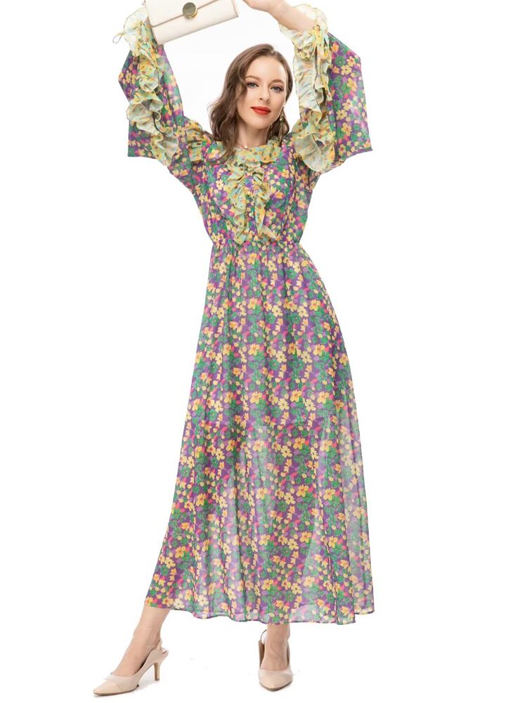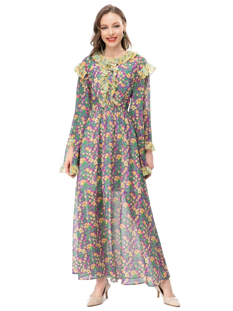 春のの有名人長袖プリント ロング ドレス パーティー ホリデー ドレス スプリング 春物
