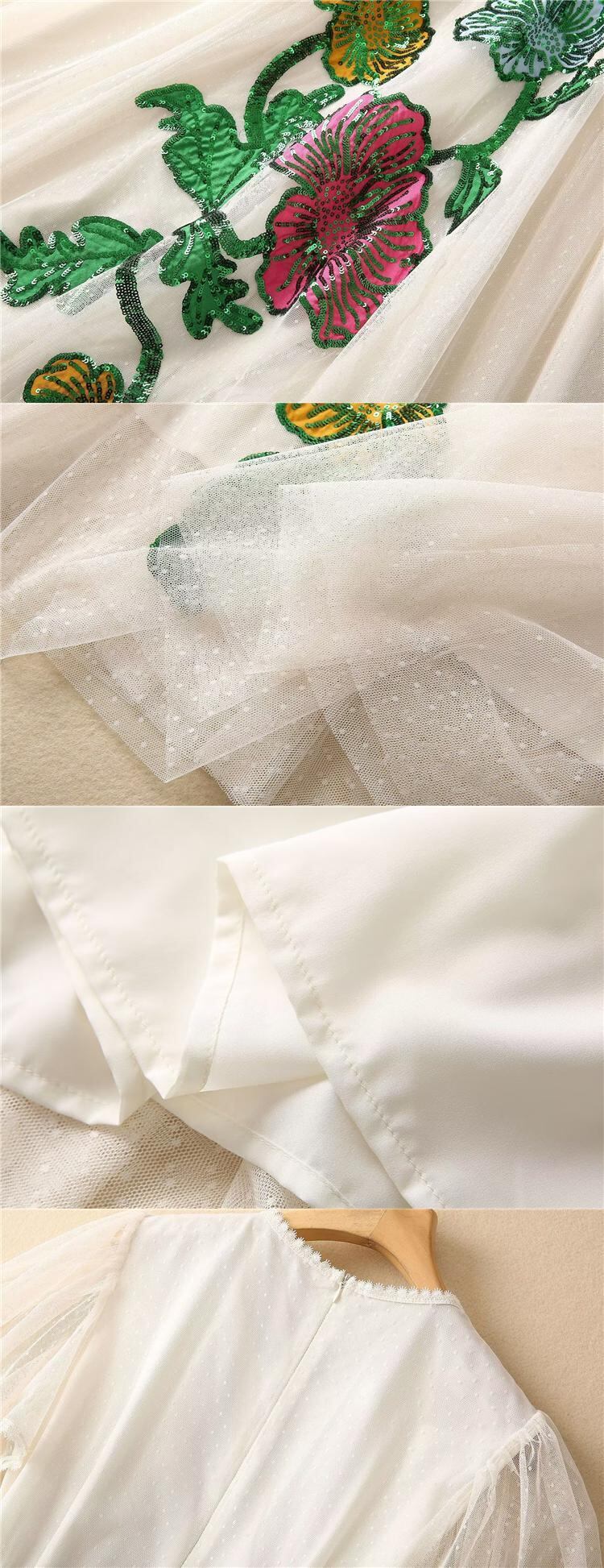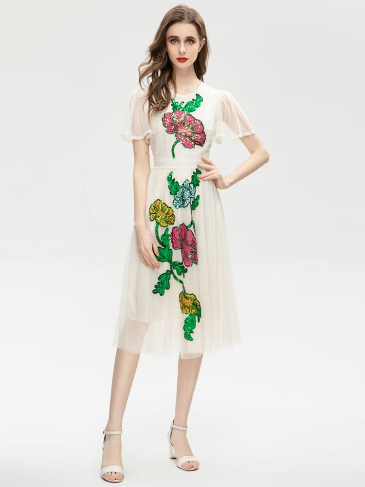夏豪華有名人スパンコール刺繍メッシュ ミディ ドレス パーティー サマー 夏物