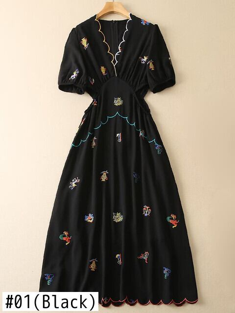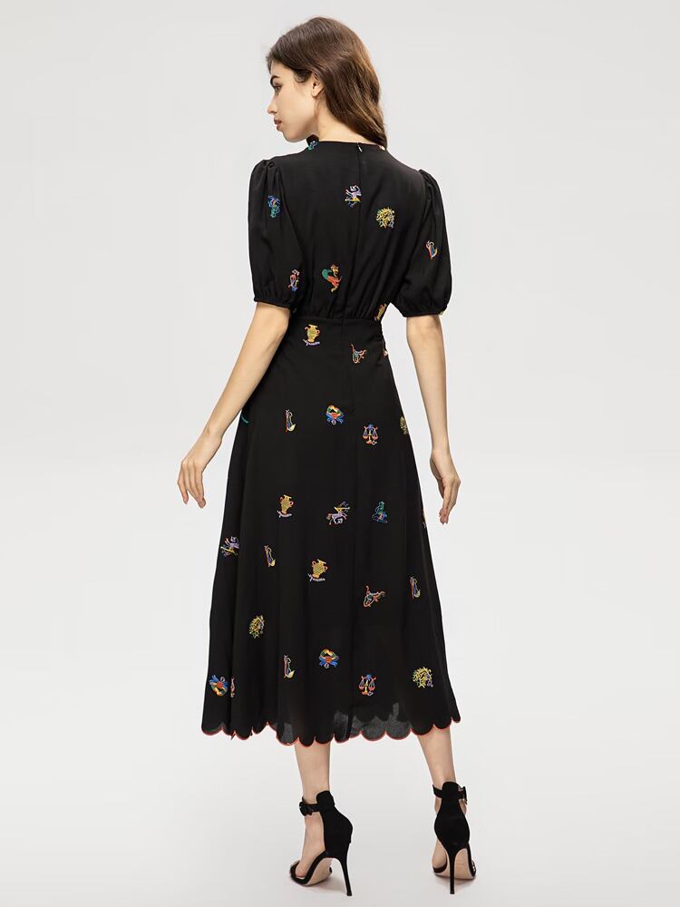 夏有名人半袖刺繍黒ミディ ドレス パーティー ホリデー ショート ブラック ハーフスリーブ サマー 夏物