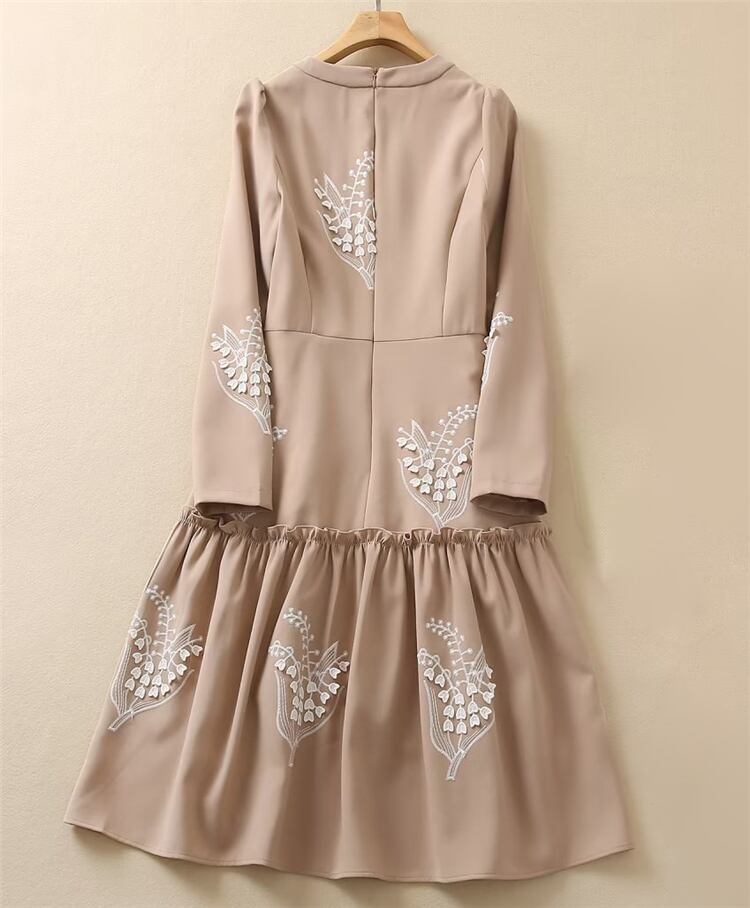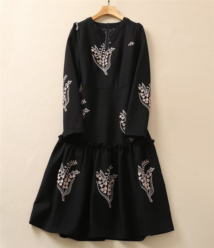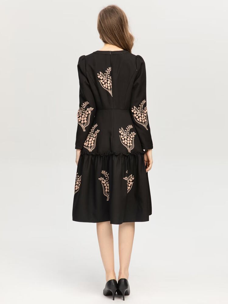 春秋有名人長袖刺繍黒ミディ ドレス パーティー ロング ブラック スプリング 春物 オータム 秋物