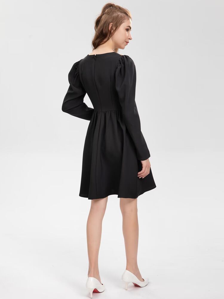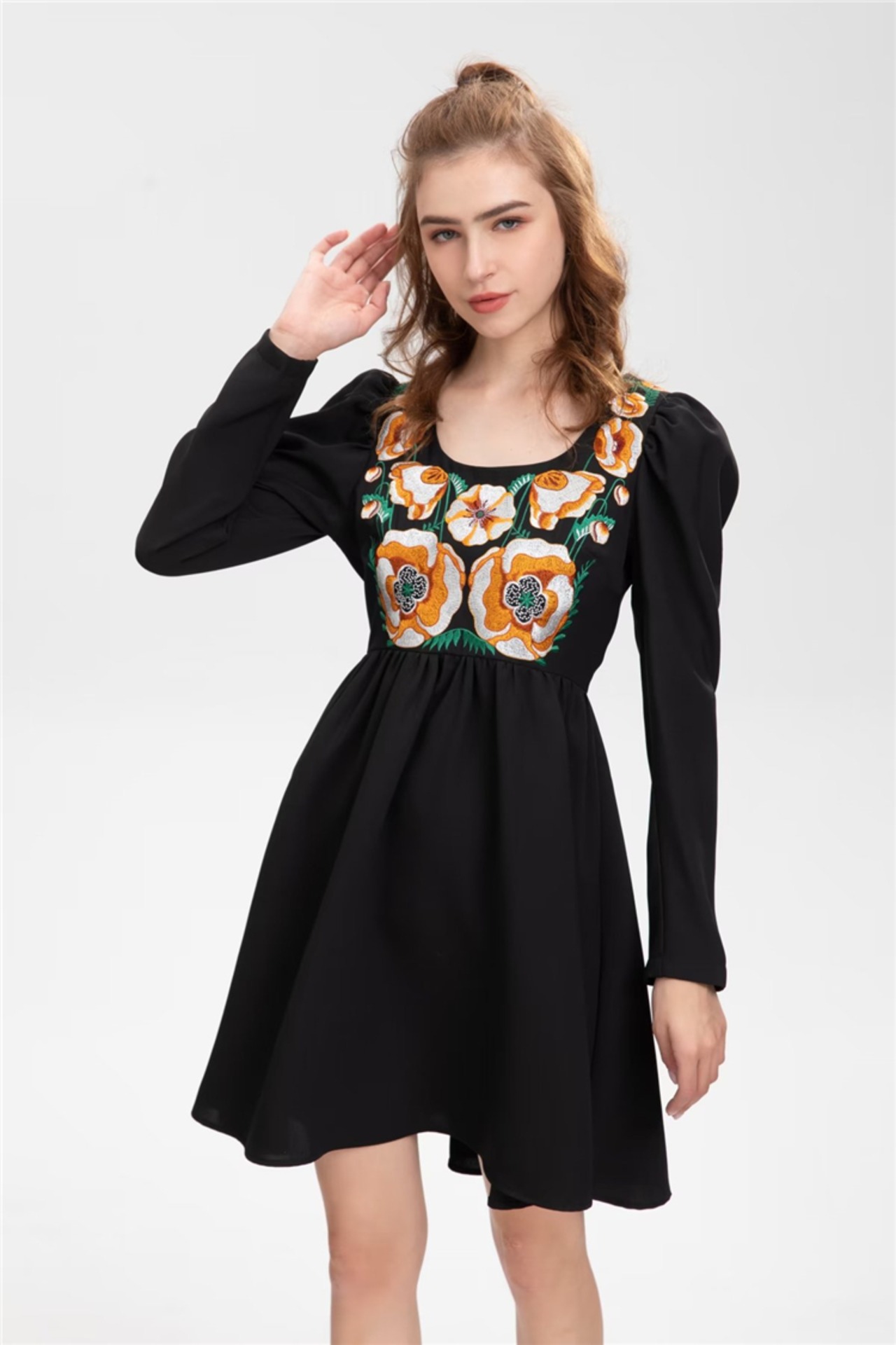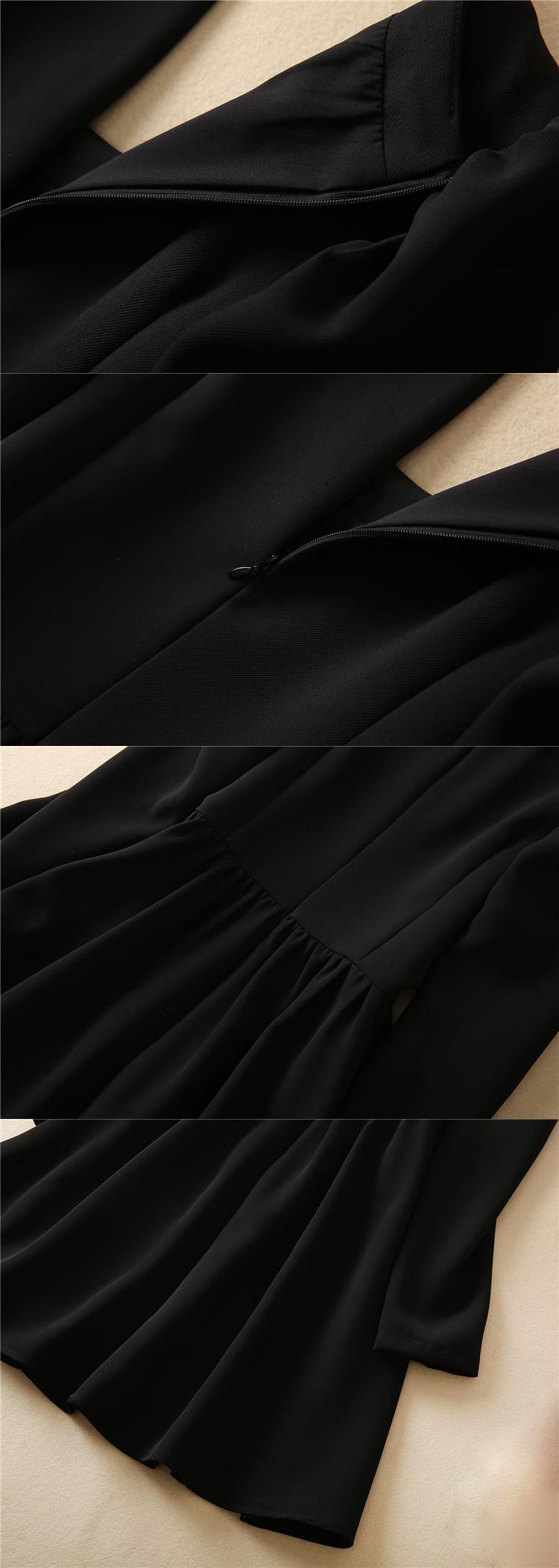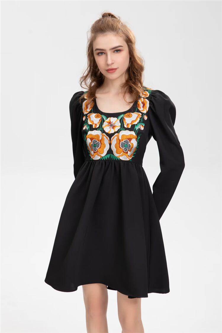 春秋セレブ長袖刺繍黒ドレスパーティーホリデー ロング ブラック スプリング 春物 オータム 秋物