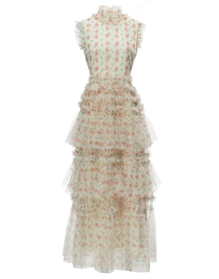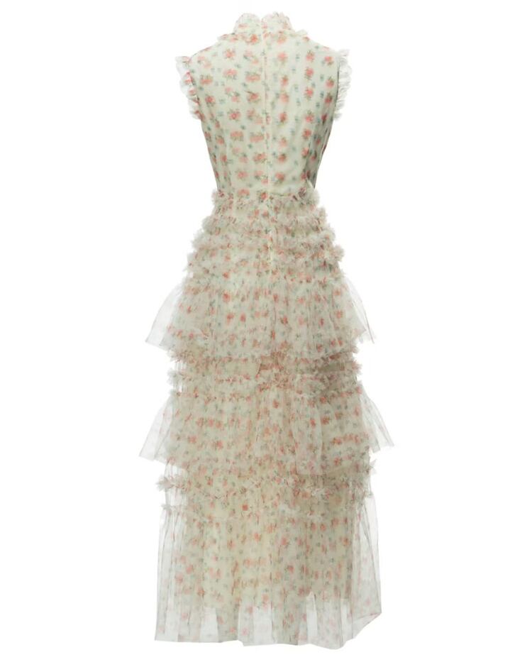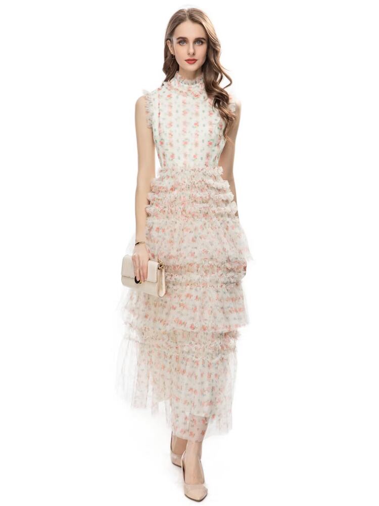 夏豪華有名人プリント フリル メッシュ ロング ドレス パーティー休暇 サマー 夏物