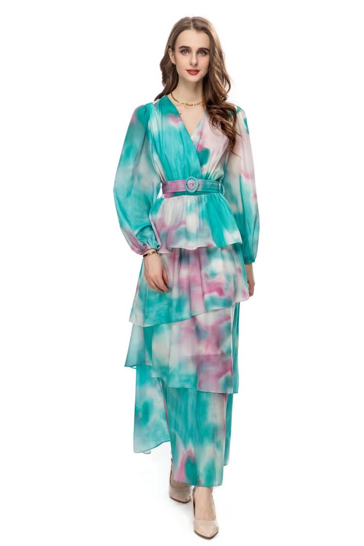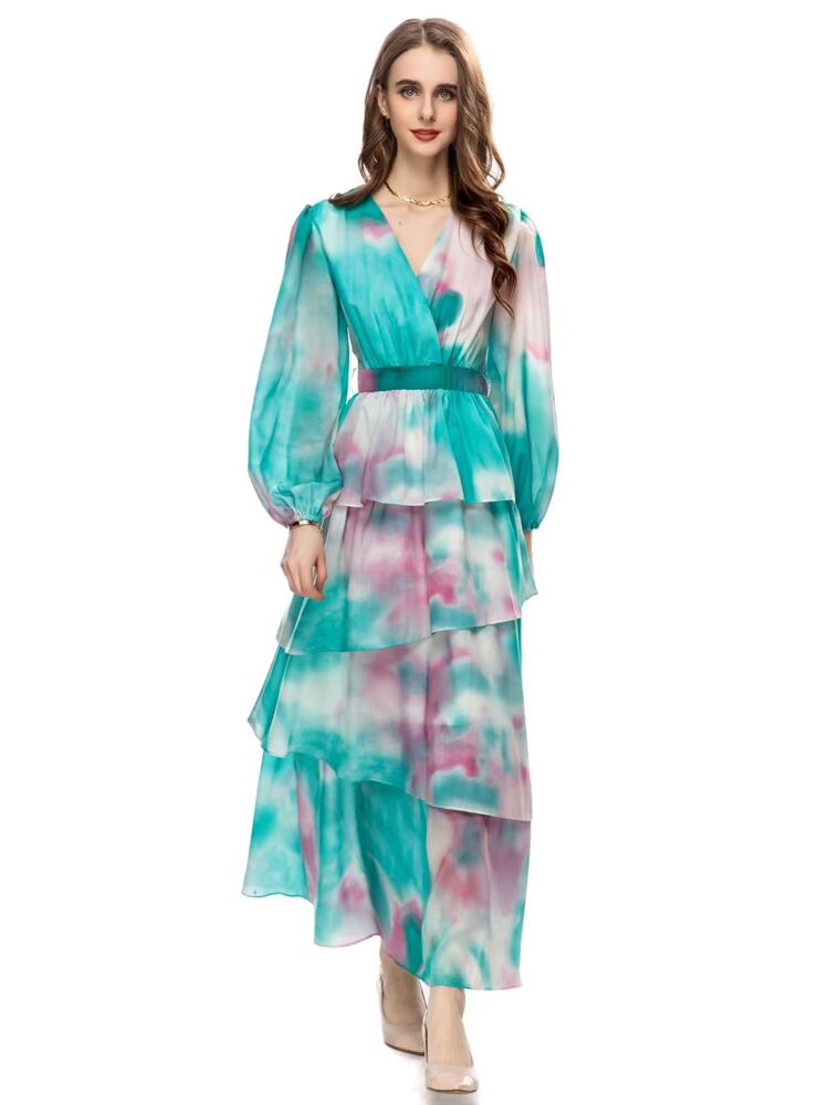 春有名人長袖フリル ロング ドレス パーティー休暇 ラッフル スプリング 春物