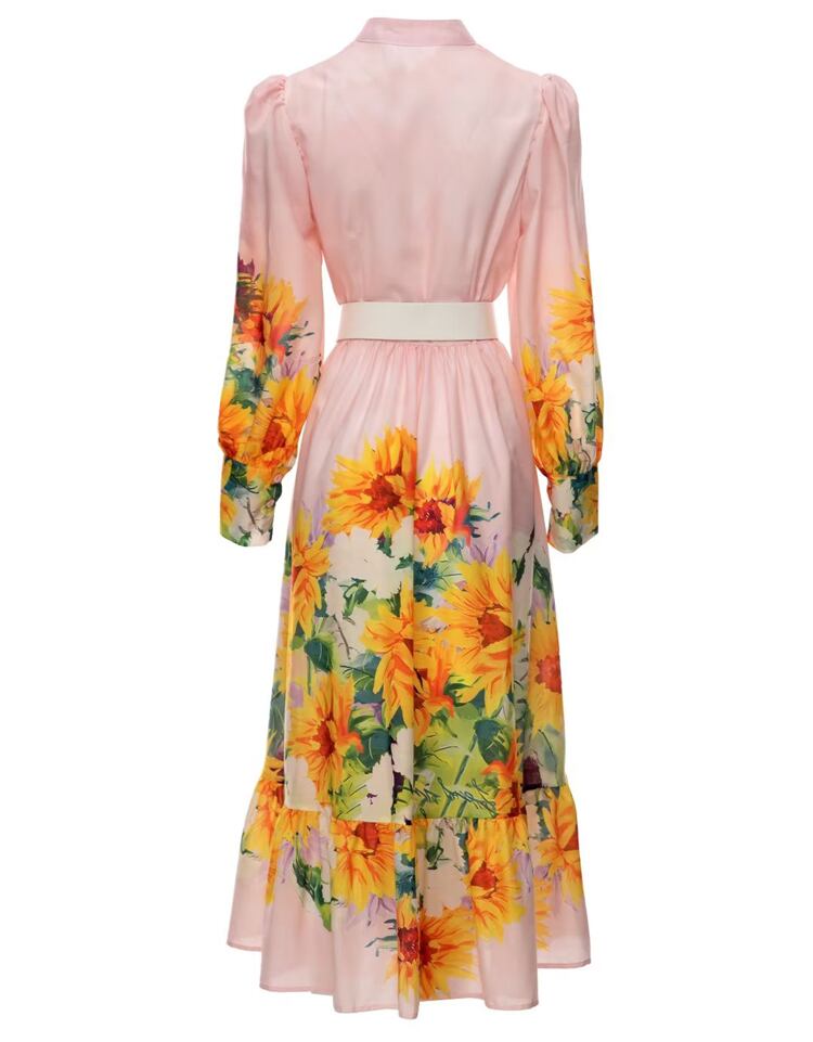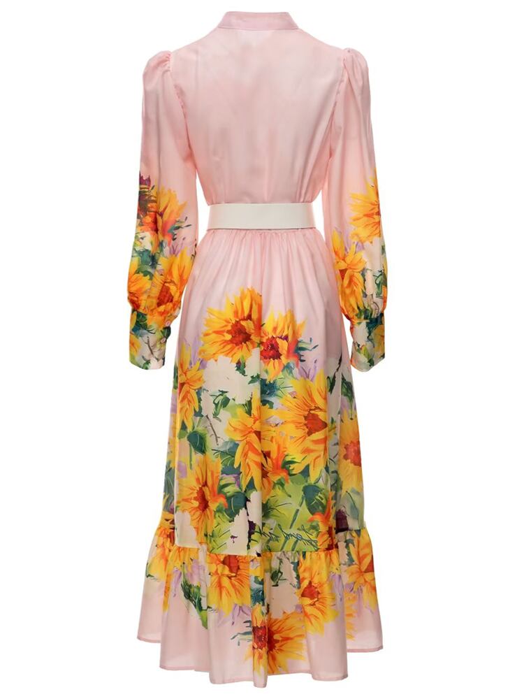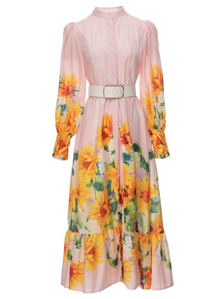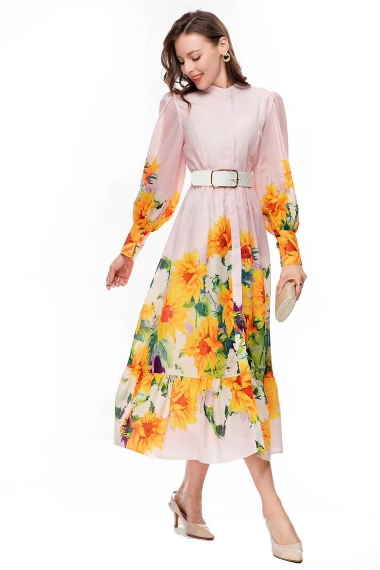 春有名人プリント長袖ベルト スリム ミディ ドレス パーティー ロング スプリング 春物 ハーネス