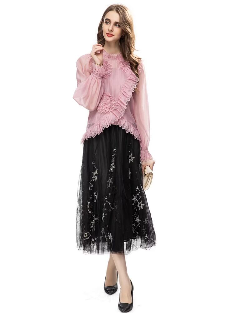 春夏レディースセット長袖シャツトップブラックメッシュスカートスーツ ロング スプリング 春物 サマー 夏物
