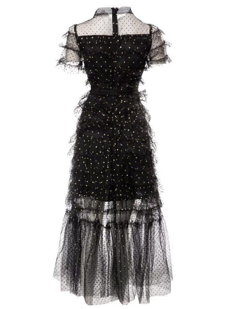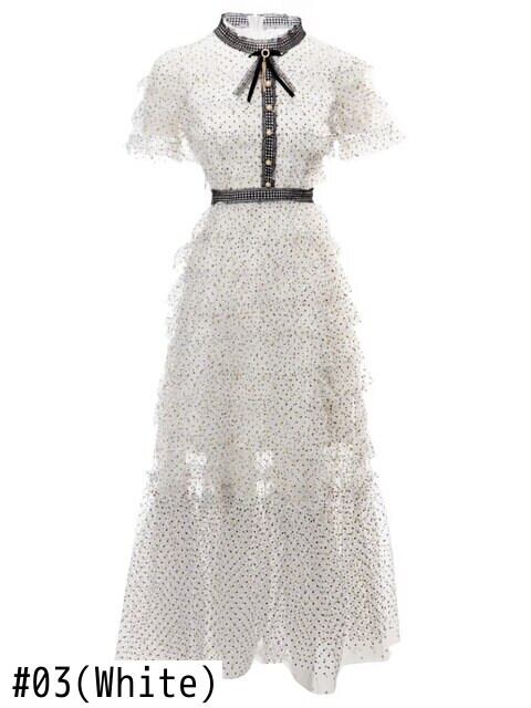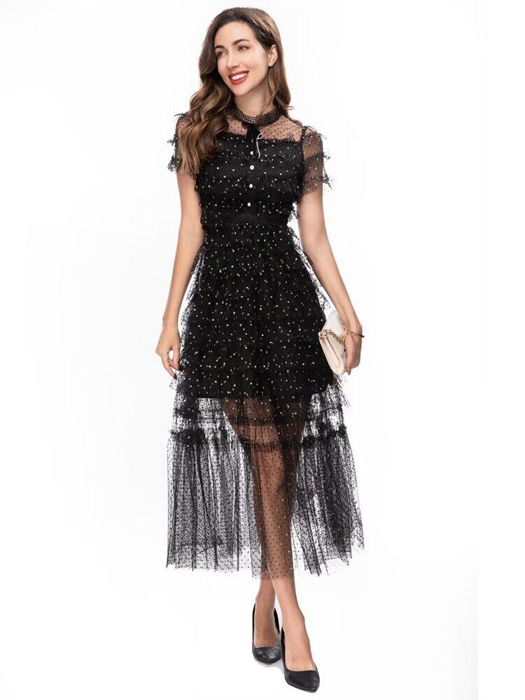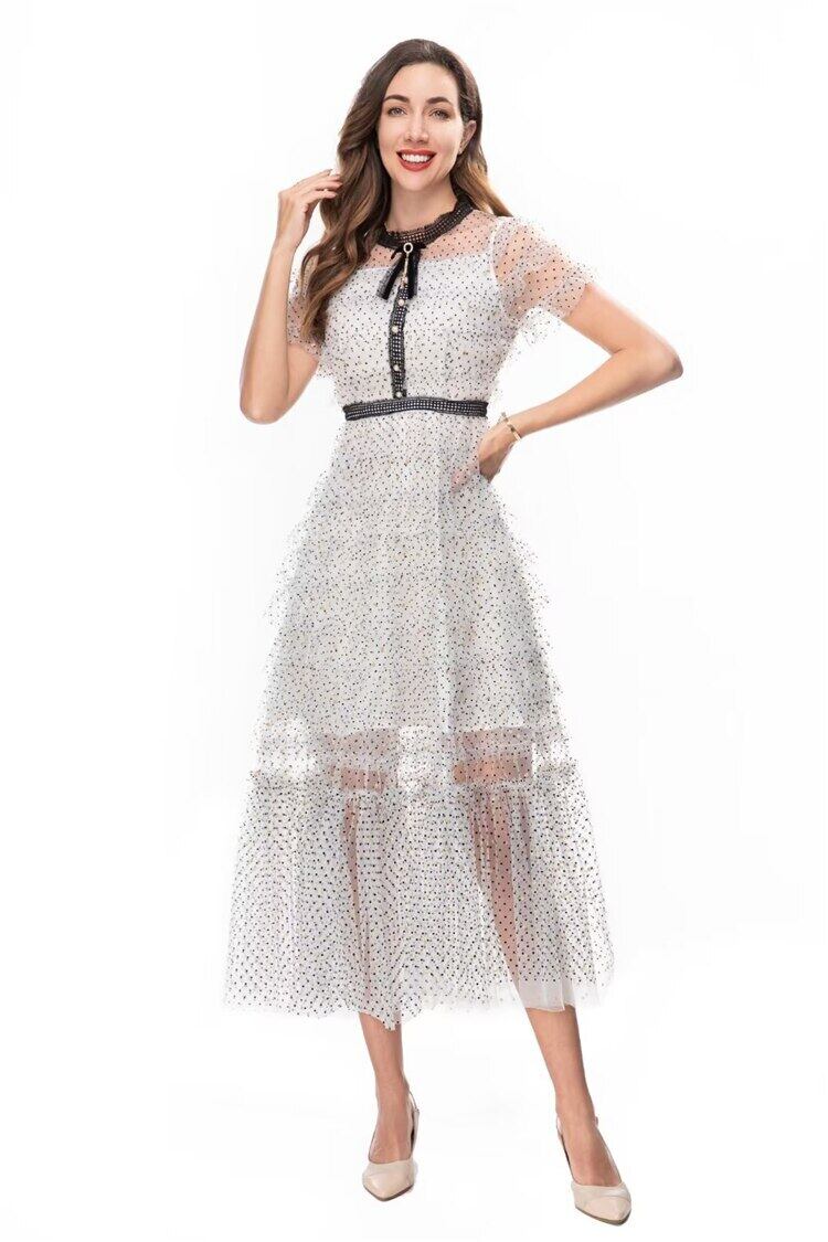 夏有名人半袖ドット プリント スリム メッシュ ミディ ドレス パーティー休暇 ショート ハーフスリーブ サマー 夏物