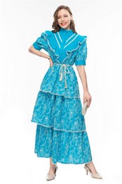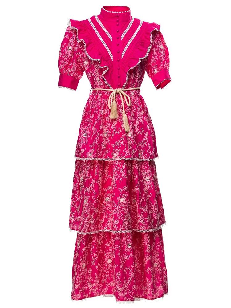 夏レディースゴージャスセレブ半袖刺繍フリルロングドレスパーティー ショート ハーフスリーブ ラッフル サマー 夏物