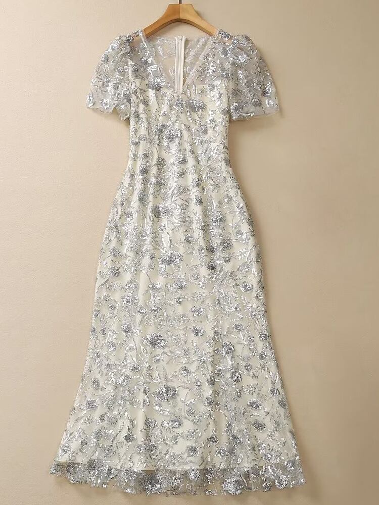 夏ゴージャス半袖スパンコール刺繍ミディ ドレス セクシーパーティー ショート ハーフスリーブ サマー 夏物