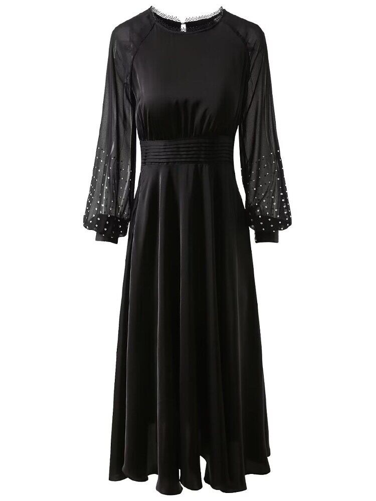 春夏レディースセレブロングスリーブブラックミディドレスパーティー 長袖 スプリング 春物 サマー 夏物