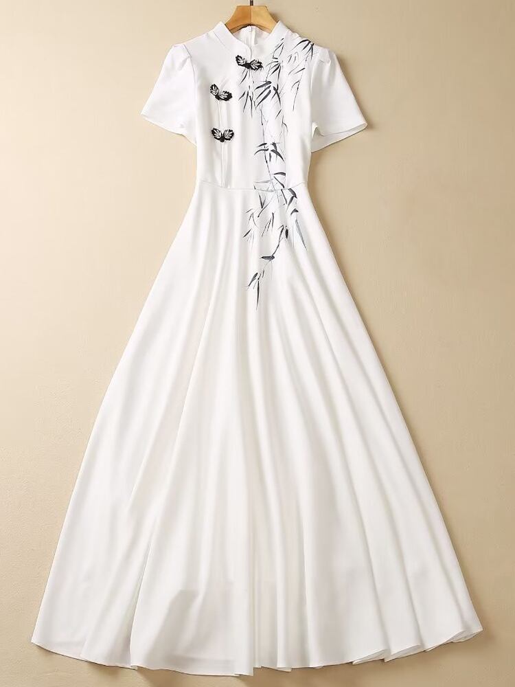 夏ゴージャス半袖プリント スリム フィット ホワイト ミディ ドレス パーティー ショート ハーフスリーブ サマー 夏物