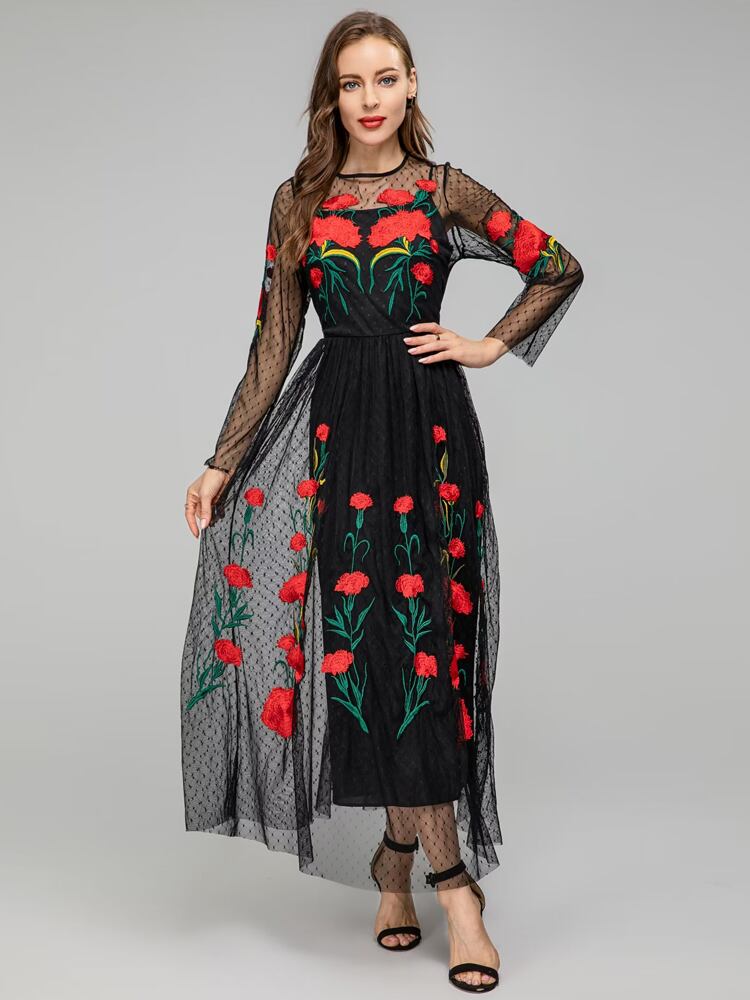 春夏レディース長袖刺繍ミディドレスパーティードレス ロング スプリング 春物 サマー 夏物