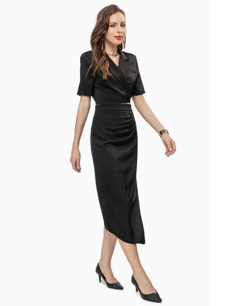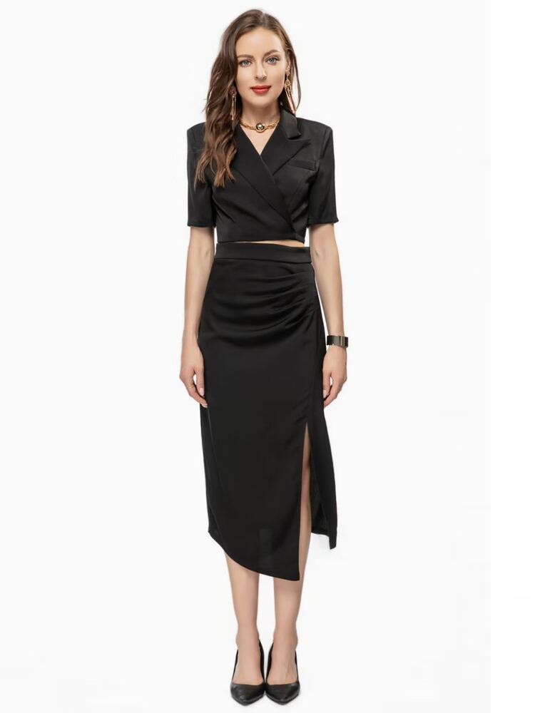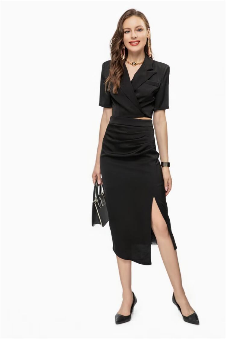 夏セットショートトップス黒ハーフスカート職場スーツ ブラック レース サマー 夏物