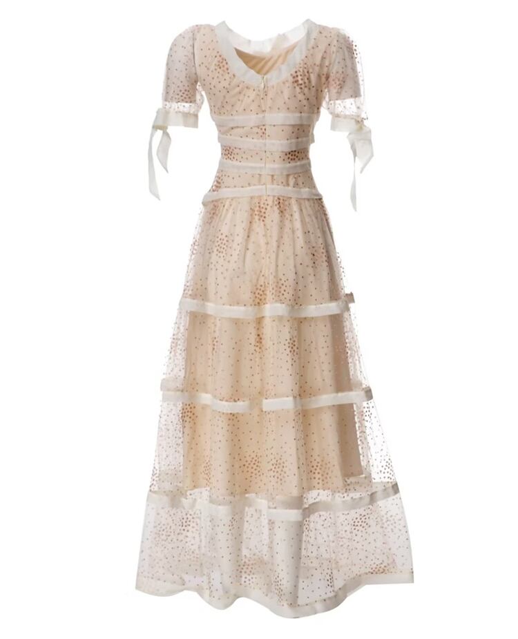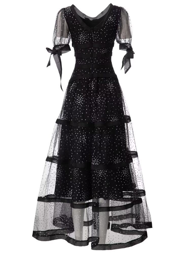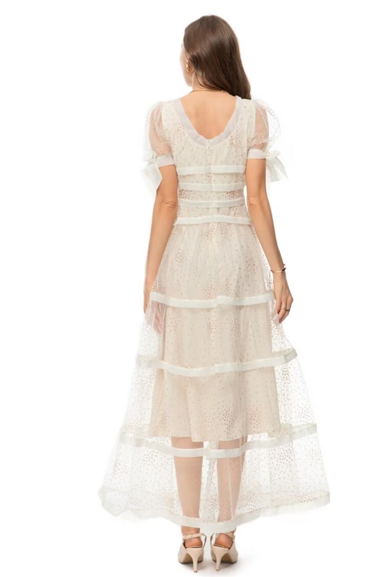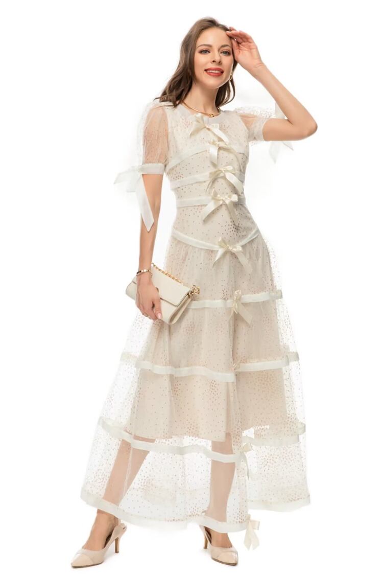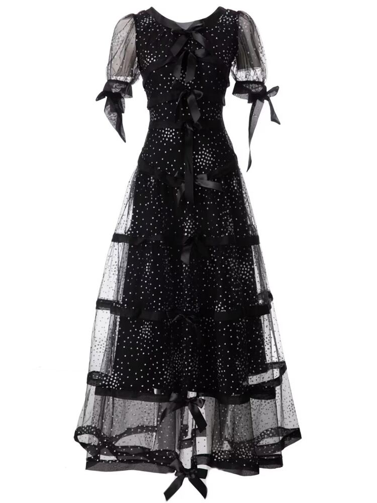 夏リボンアップリケメッシュ半袖ロングドレスパーティーシック ショート ハーフスリーブ サマー 夏物
