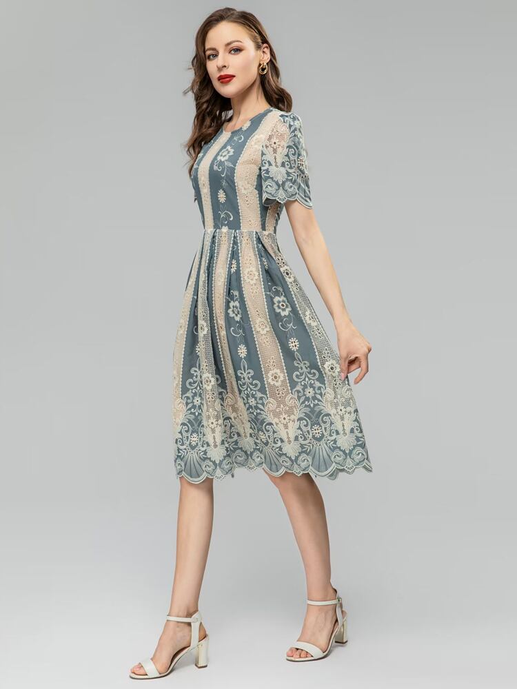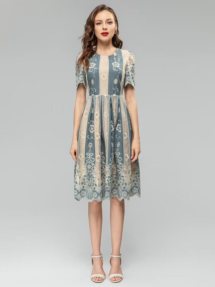 夏レディース半袖刺繍ミディドレスパーティーシックドレス ショート ハーフスリーブ サマー 夏物