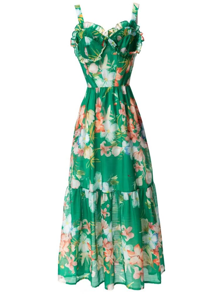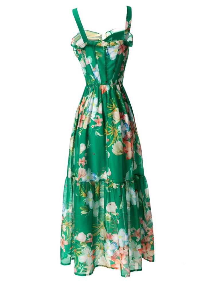 夏自由奔放生きるプリント グリーン ストラップ ロング ドレス パーティー シック サマー 夏物