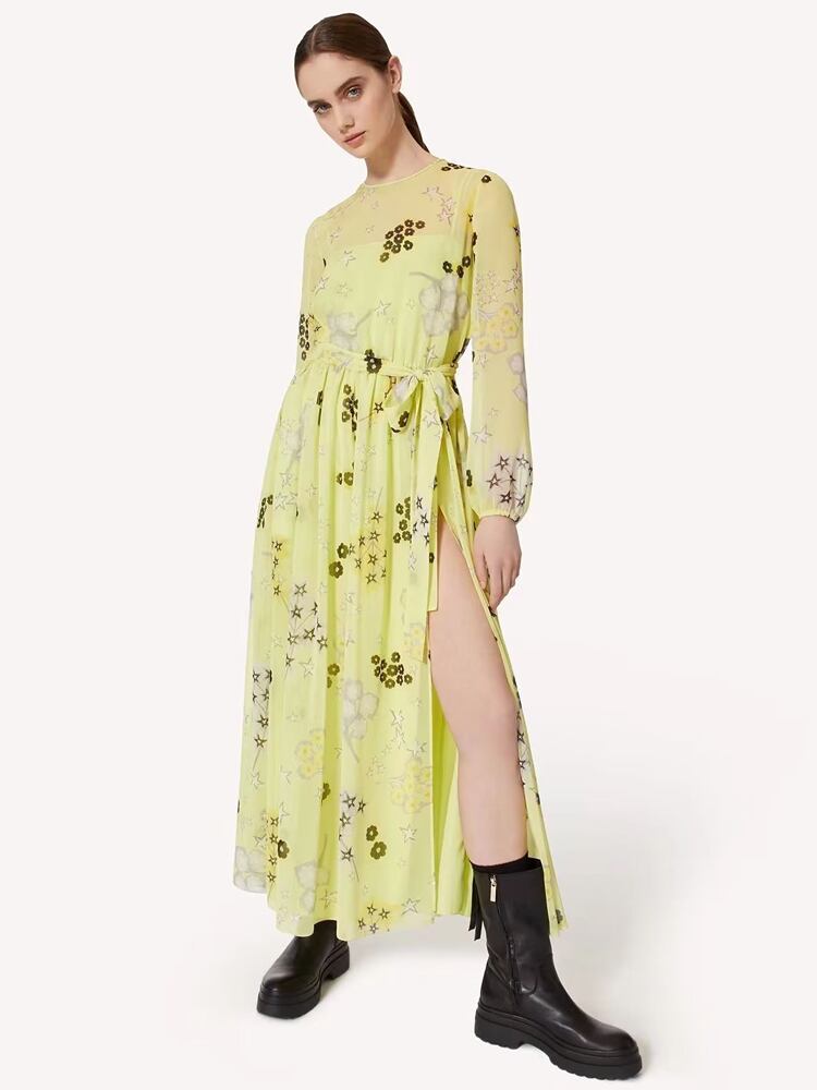 春夏レディース長袖プリントシフォンミディドレスパーティードレス ロング スプリング 春物 サマー 夏物