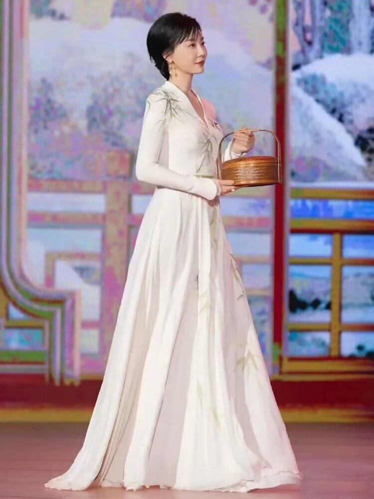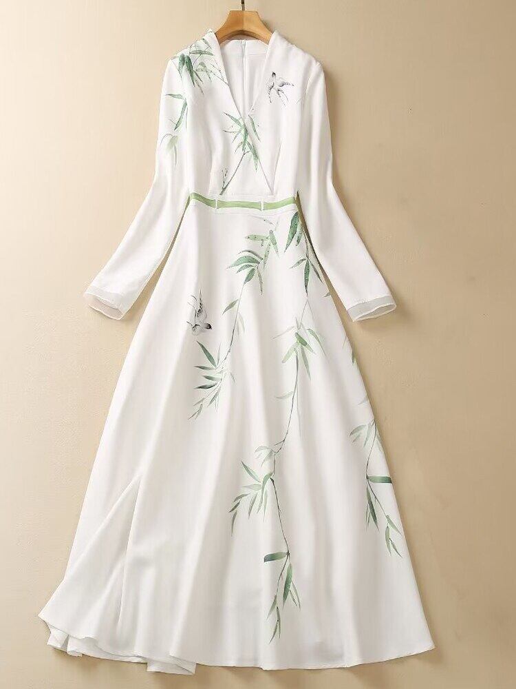 春夏レディースゴージャス長袖プリント白ロングドレスパーティー ホワイト スプリング 春物 サマー 夏物