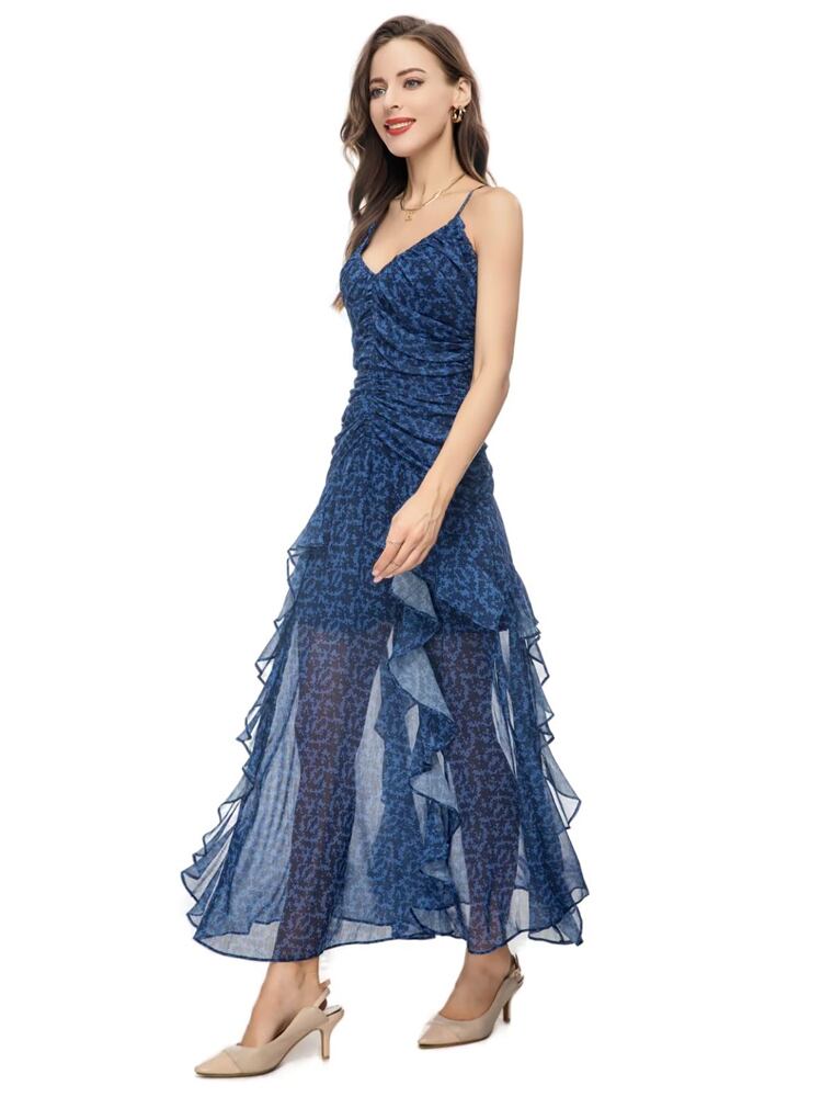 夏レディースセレブストラッププリントシフォンロングドレスパーティー サマー 夏物