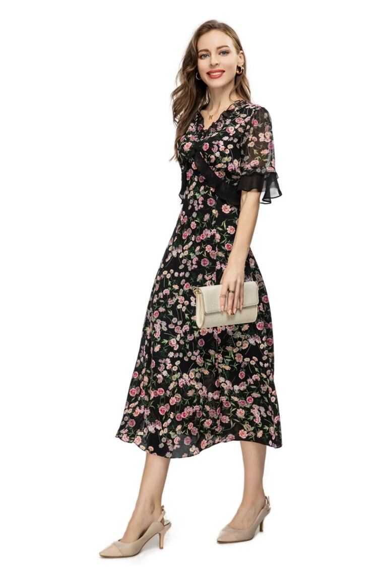 夏セレブ半袖プリントブラックドレスパーティー ショート ハーフスリーブ サマー 夏物