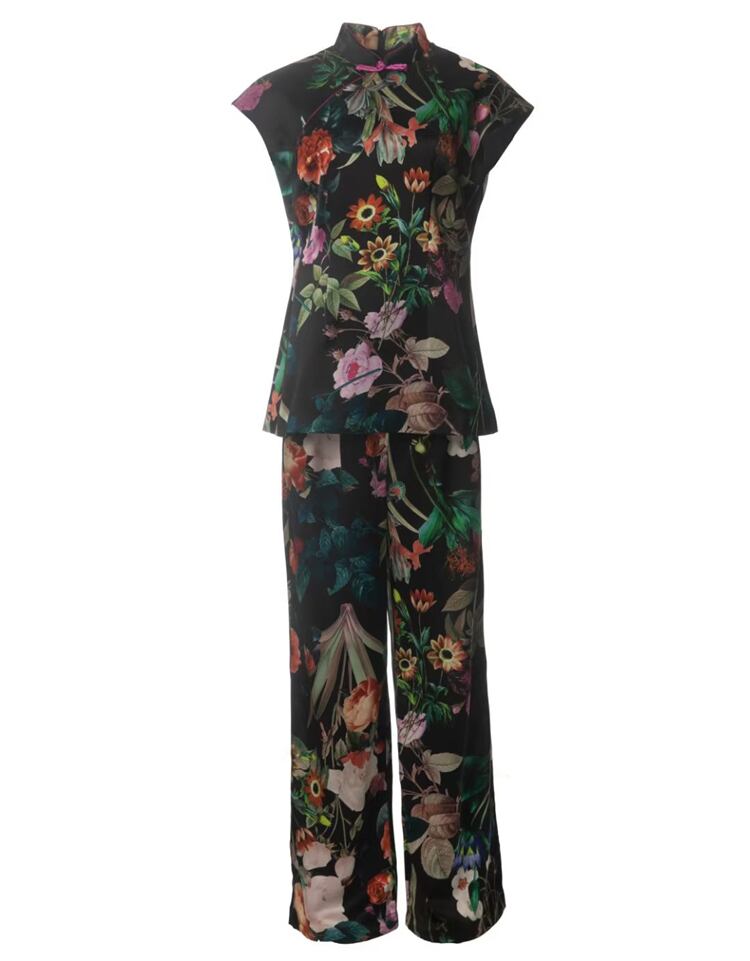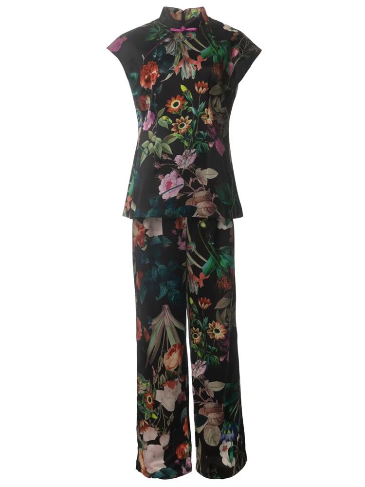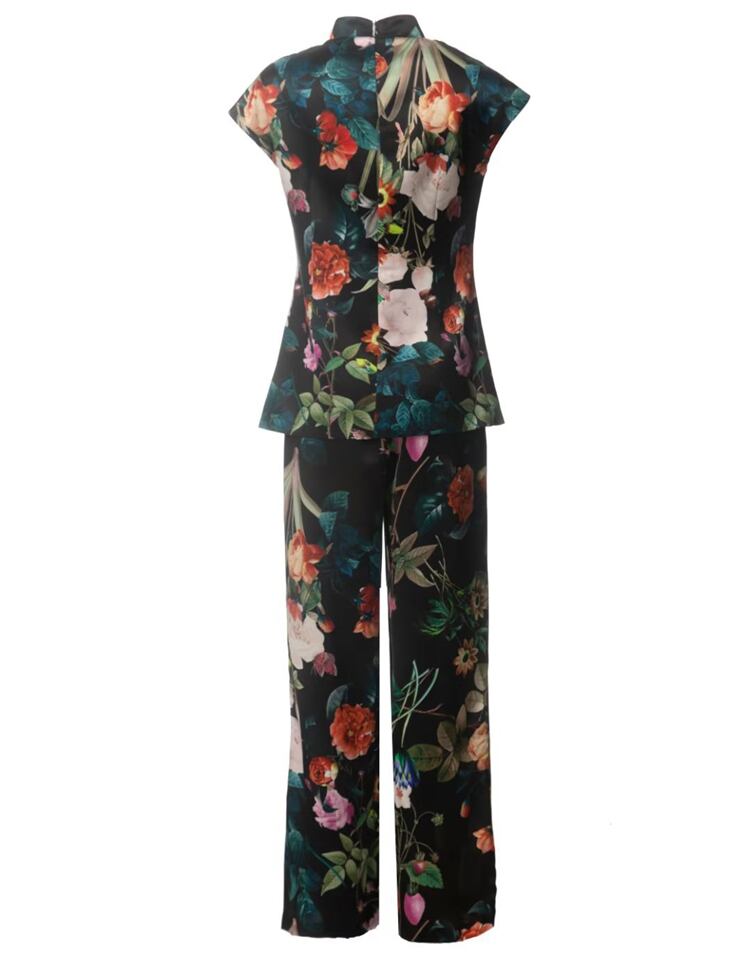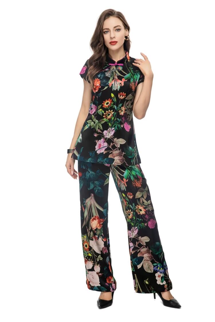 春夏レディースセットブラックプリントトップススリムパンツスーツ スプリング 春物 サマー 夏物