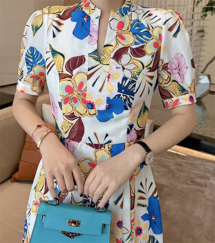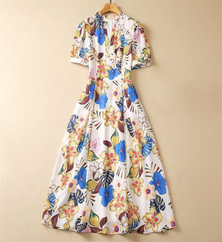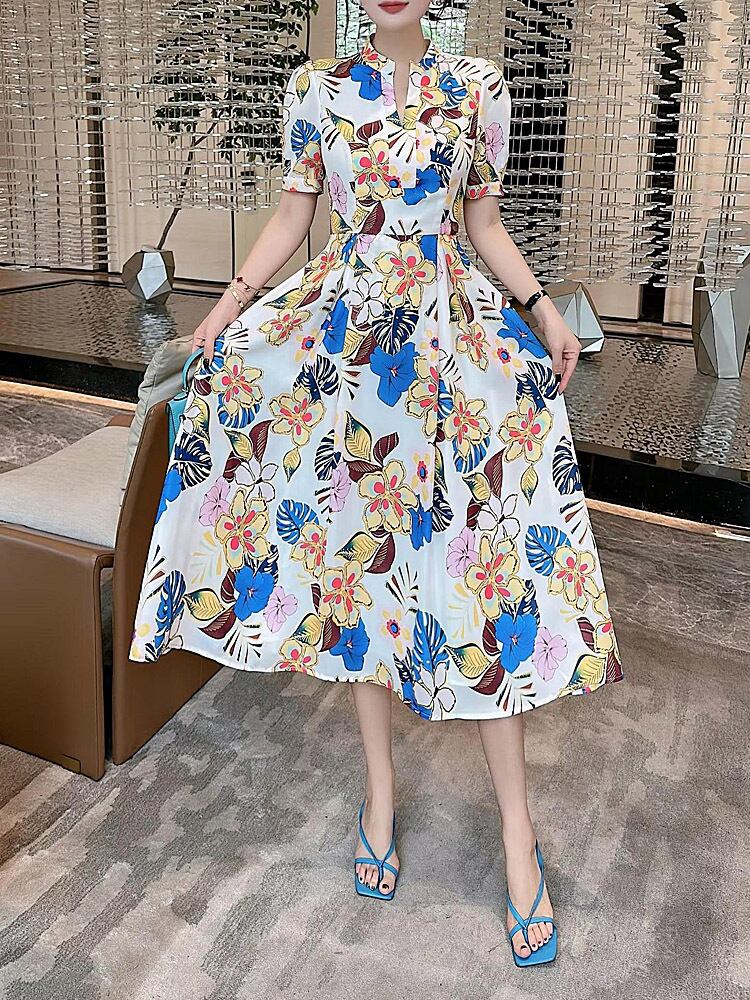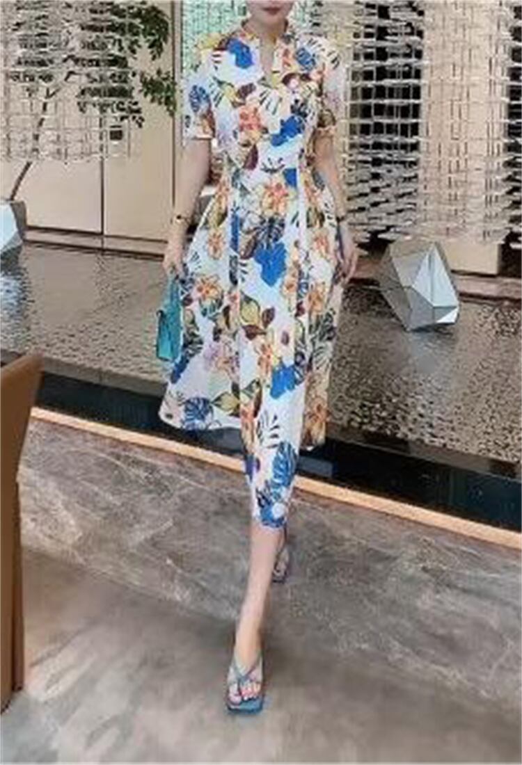 夏レディース半袖プリントミディドレスパーティー ショート ハーフスリーブ サマー 夏物