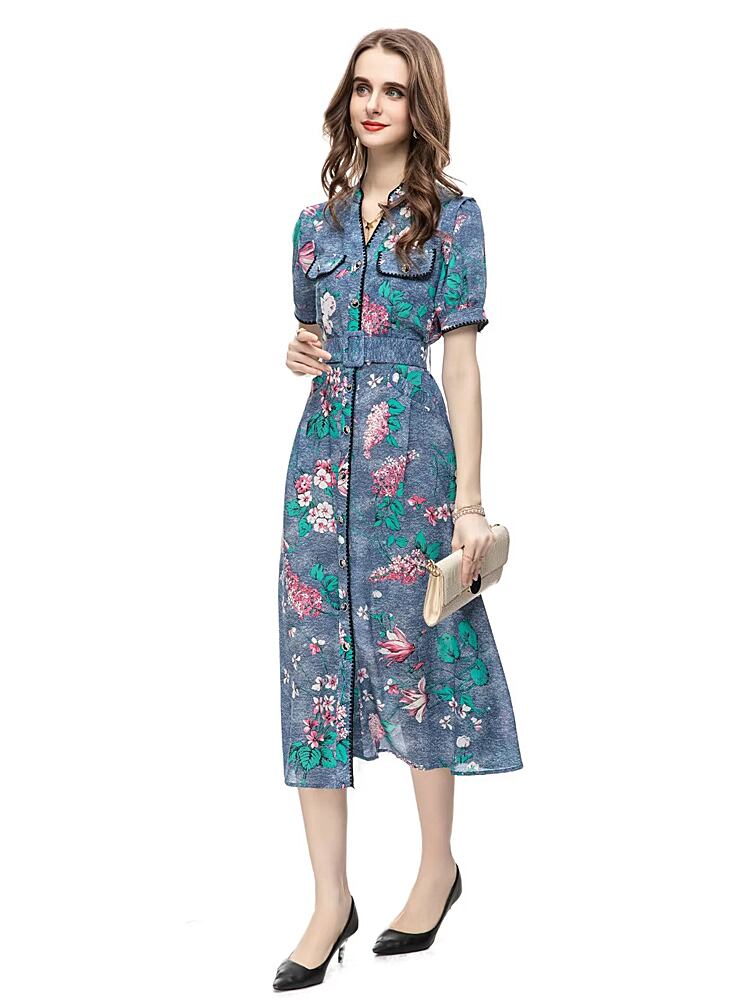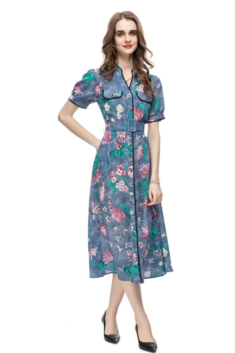 夏プリントベルトブルーボヘミアンボタン滑走路セレブパーティーミディドレス サマー 夏物 ハーネス