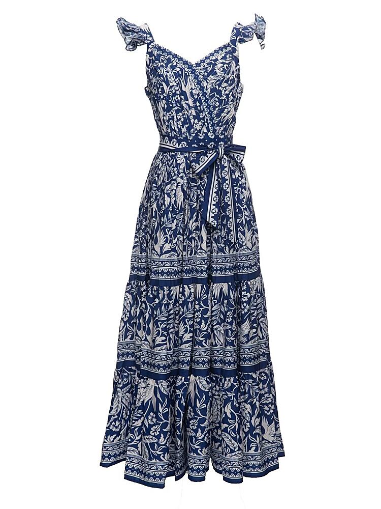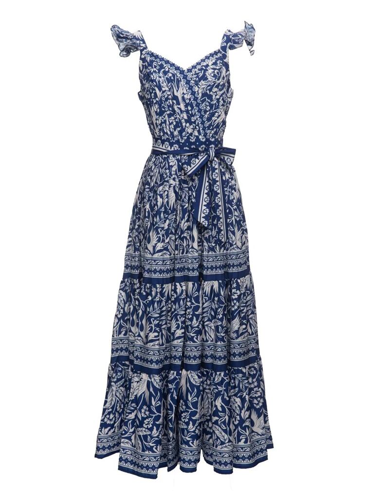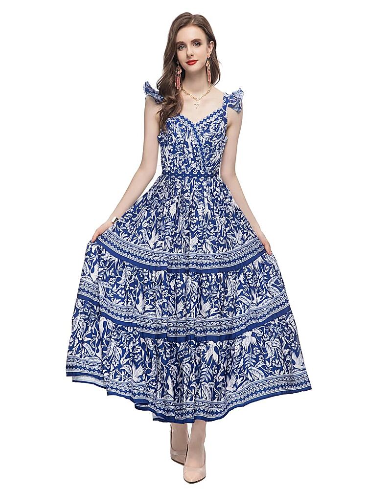 夏プリントボヘミアンブルーセクシーパーティーセクシーホリデーパーティー甘いキャミソールストラップロングドレス 大人ガーリー スウィート キュート カジュアル サマー 夏物