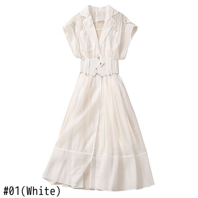 夏白ベルトスリムユニーク甘い女子気質パーティーオフィスミディドレス ホワイト 大人ガーリー スウィート キュート カジュアル サマー 夏物 ハーネス 会社 学校 通勤や通学にも