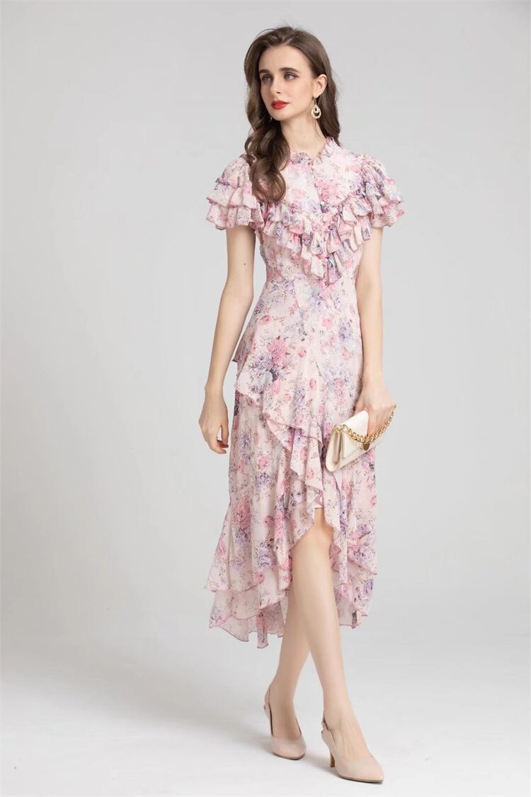 サマープリント高級ゴージャスボヘミアンビーチホリデー不規則滑走路シックパーティーピンクミディドレス 夏物